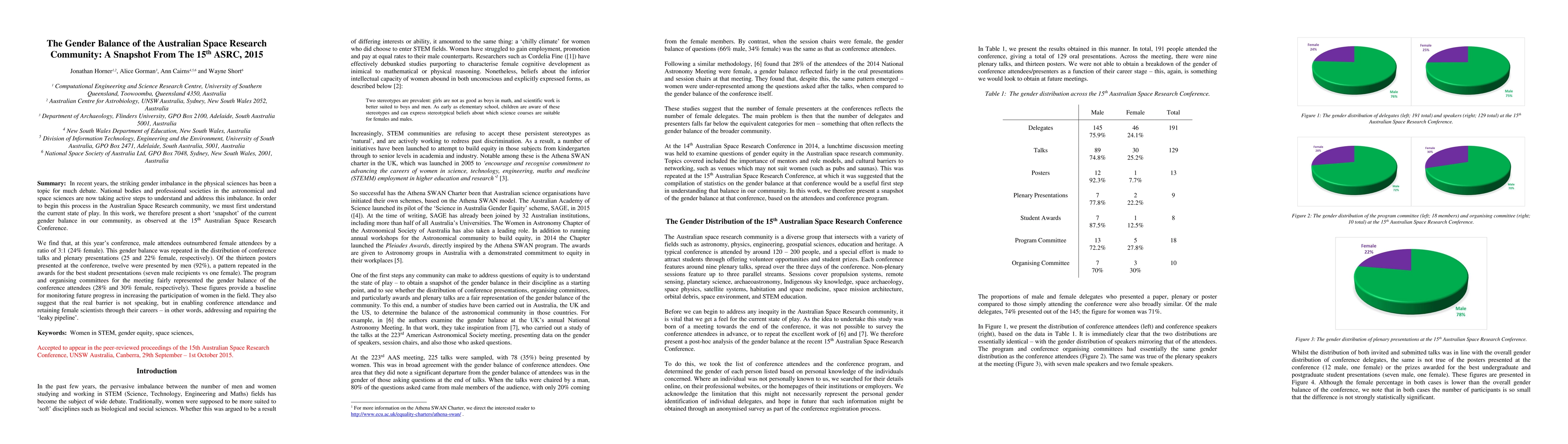 This paper provides a snapshot of gender balance at the 15th Australian Space Research Conference, revealing a significant male dominance with only 24% female attendees. The underrepresentation of women extends to conference talks, posters, and awards, suggesting a need to address barriers to female participation and retention in the field.
