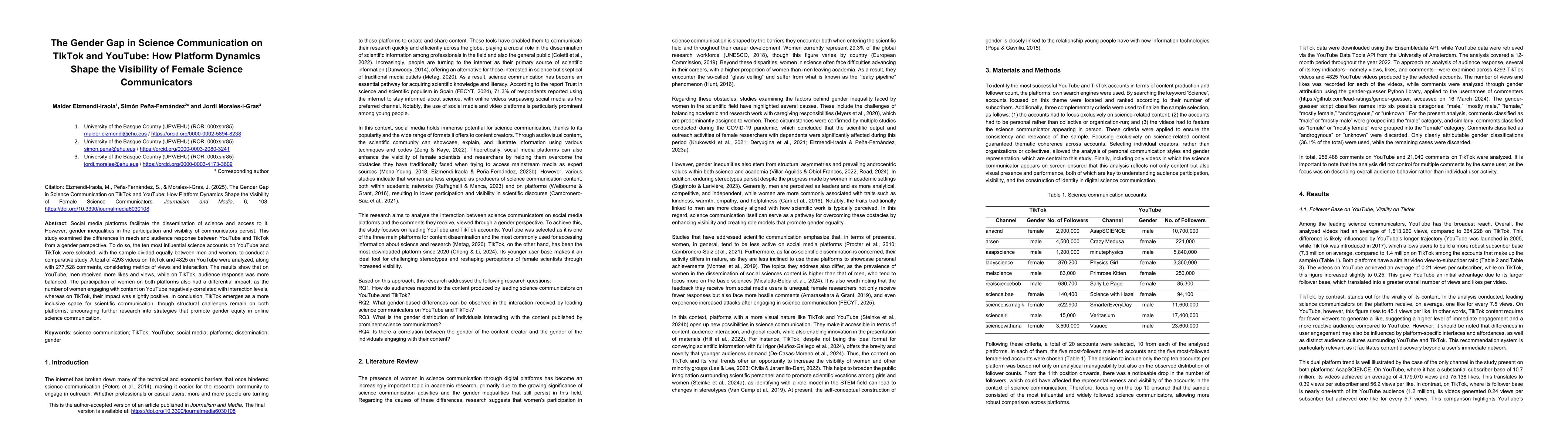 Social media platforms facilitate the dissemination of science and access to it. However, gender inequalities in the participation and visibility of communicators persist. This study examined the differences in reach and audience response between YouTube and TikTok from a gender perspective. To do so, the ten most influential science accounts on YouTube and TikTok were selected, with the sample divided equally between men and women, to conduct a comparative study. A total of 4293 videos on TikTok and 4825 on YouTube were analyzed, along with 277,528 comments, considering metrics of views and interaction. The results show that on YouTube, men received more likes and views, while on TikTok, audience response was more balanced. The participation of women on both platforms also had a differential impact, as the number of women engaging with content on YouTube negatively correlated with interaction levels, whereas on TikTok, their impact was slightly positive. In conclusion, TikTok emerges as a more inclusive space for scientific communication, though structural challenges remain on both platforms, encouraging further research into strategies that promote gender equity in online science communication.