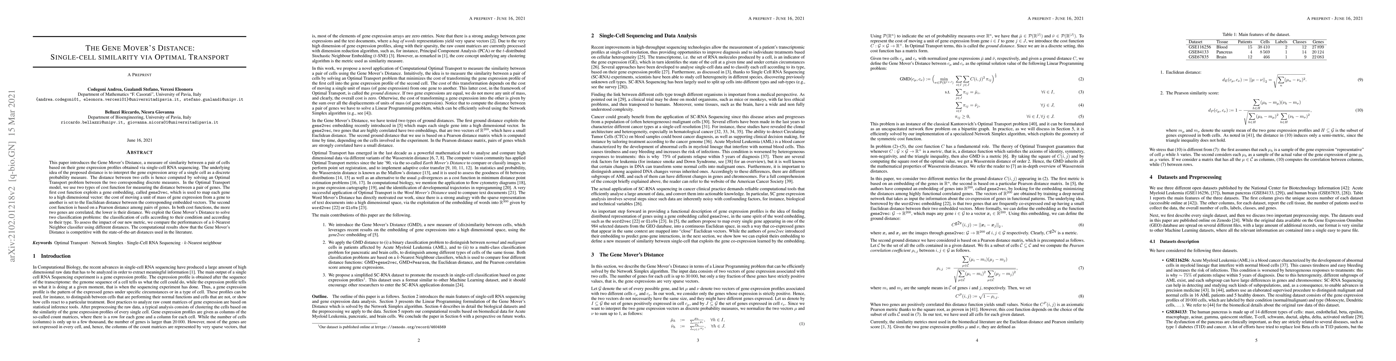 This paper introduces the Gene Mover's Distance, a measure of similarity between a pair of cells based on their gene expression profiles obtained via single-cell RNA sequencing. The underlying idea of the proposed distance is to interpret the gene expression array of a single cell as a discrete probability measure. The distance between two cells is hence computed by solving an Optimal Transport problem between the two corresponding discrete measures. In the Optimal Transport model, we use two types of cost function for measuring the distance between a pair of genes. The first cost function exploits a gene embedding, called gene2vec, which is used to map each gene to a high dimensional vector: the cost of moving a unit of mass of gene expression from a gene to another is set to the Euclidean distance between the corresponding embedded vectors. The second cost function is based on a Pearson distance among pairs of genes. In both cost functions, the more two genes are correlated, the lower is their distance. We exploit the Gene Mover's Distance to solve two classification problems: the classification of cells according to their condition and according to their type. To assess the impact of our new metric, we compare the performances of a $k$-Nearest Neighbor classifier using different distances. The computational results show that the Gene Mover's Distance is competitive with the state-of-the-art distances used in the literature.