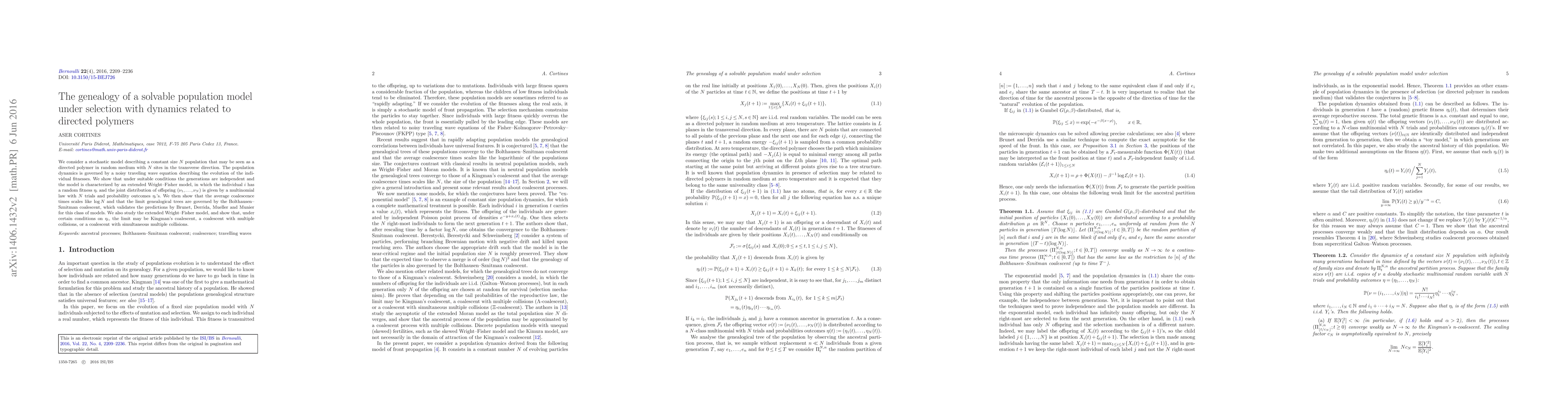 We consider a stochastic model describing a constant size $N$ population that may be seen as a directed polymer in random medium with $N$ sites in the transverse direction. The population dynamics is governed by a noisy traveling wave equation describing the evolution of the individual fitnesses. We show that under suitable conditions the generations are independent and the model is characterized by an extended Wright-Fisher model, in which the individual $i$ has a random fitness $\eta_i$ and the joint distribution of offspring $(\nu_1,\ldots,\nu_N)$ is given by a multinomial law with $N$ trials and probability outcomes $\eta_i$'s. We then show that the average coalescence times scales like $\log N$ and that the limit genealogical trees are governed by the Bolthausen-Sznitman coalescent, which validates the predictions by Brunet, Derrida, Mueller and Munier for this class of models. We also study the extended Wright-Fisher model, and show that, under certain conditions on $\eta_i$, the limit may be Kingman's coalescent, a coalescent with multiple collisions, or a coalescent with simultaneous multiple collisions.