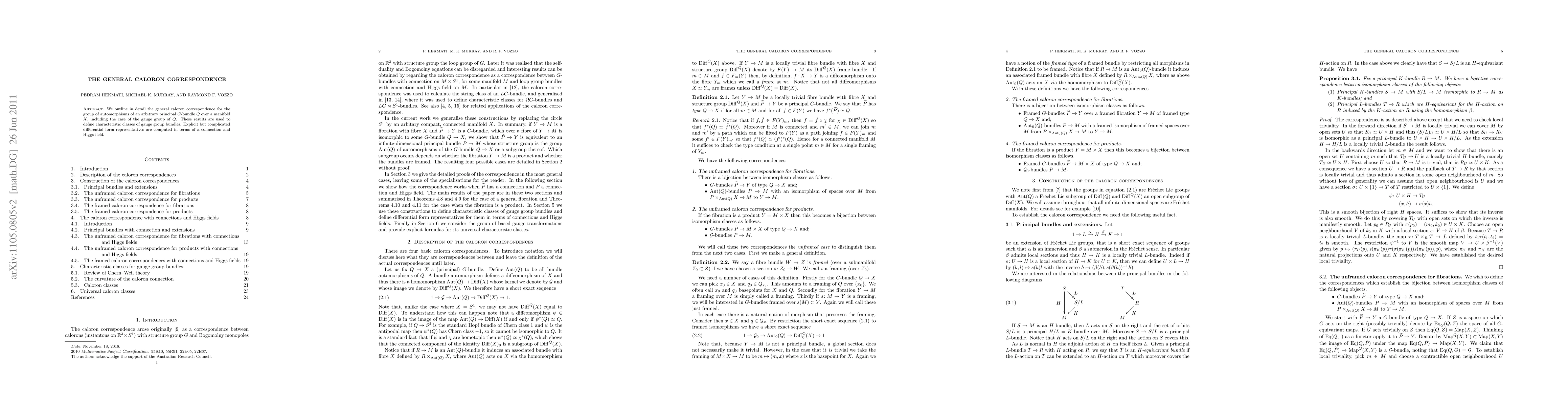 The paper outlines the general caloron correspondence for principal G-bundles over a manifold X, including the gauge group of the bundle. It details explicit differential form representatives in terms of a connection and Higgs field.