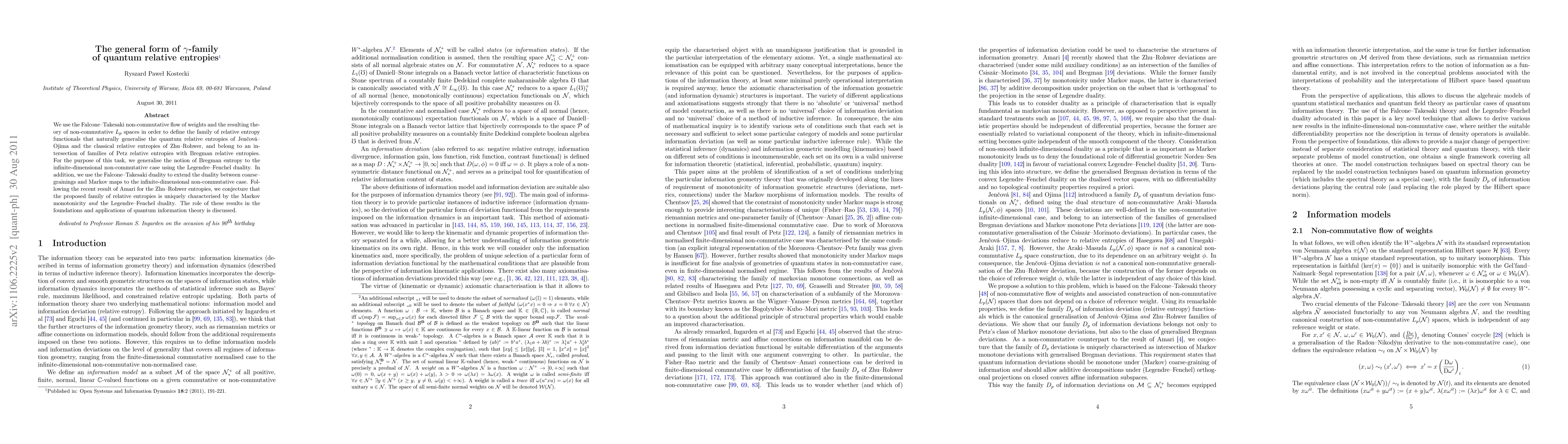 This paper defines a general form of gamma-family quantum relative entropies using non-commutative flows and Lp spaces, extending Bregman entropy to infinite dimensions. It conjectures that these entropies are uniquely characterized by Markov monotonicity and Legendre-Fenchel duality, with implications for quantum information theory.