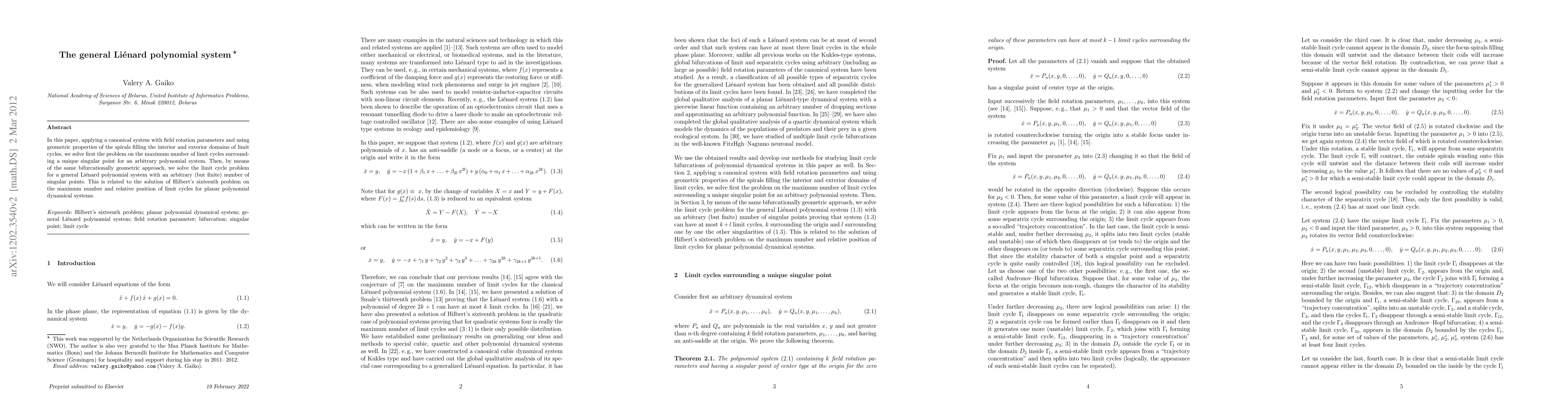 This paper solves two problems related to limit cycles in polynomial systems: finding the maximum number of limit cycles surrounding a singular point and determining the relative position of limit cycles for general Li’enard polynomial systems with arbitrary numbers of singular points.