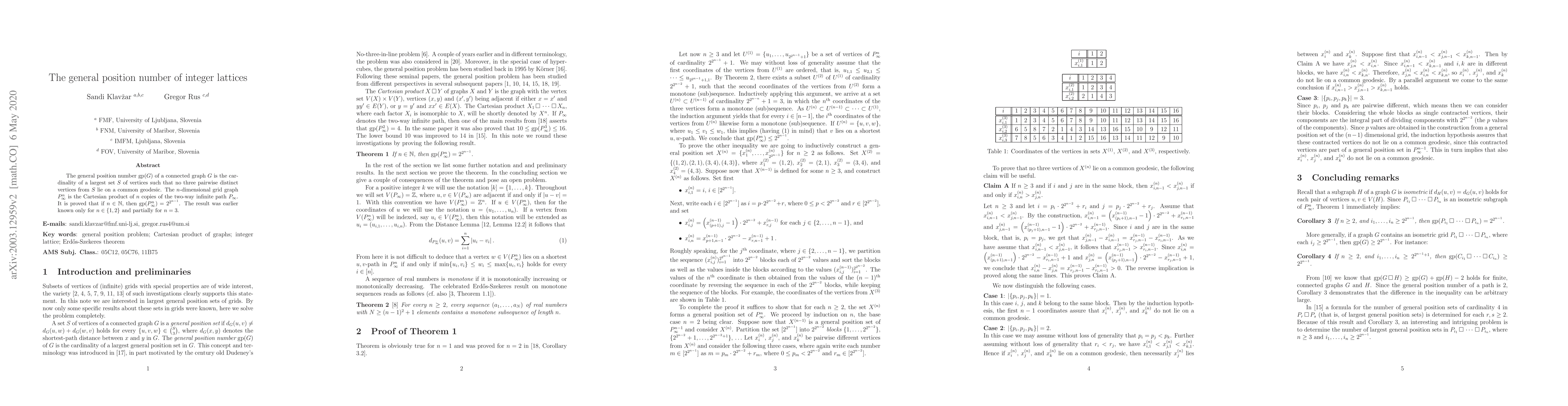 The general position number ${\rm gp}(G)$ of a connected graph $G$ is the cardinality of a largest set $S$ of vertices such that no three pairwise distinct vertices from $S$ lie on a common geodesic. The $n$-dimensional grid graph $\pn$ is the Cartesian product of $n$ copies of the two-way infinite path $P_\infty$. It is proved that if $n\in {\mathbb N}$, then ${\rm gp}({P_\infty^n}) = 2^{2^{n-1}}$. The result was earlier known only for $n\in \{1,2\}$ and partially for $n=3$.