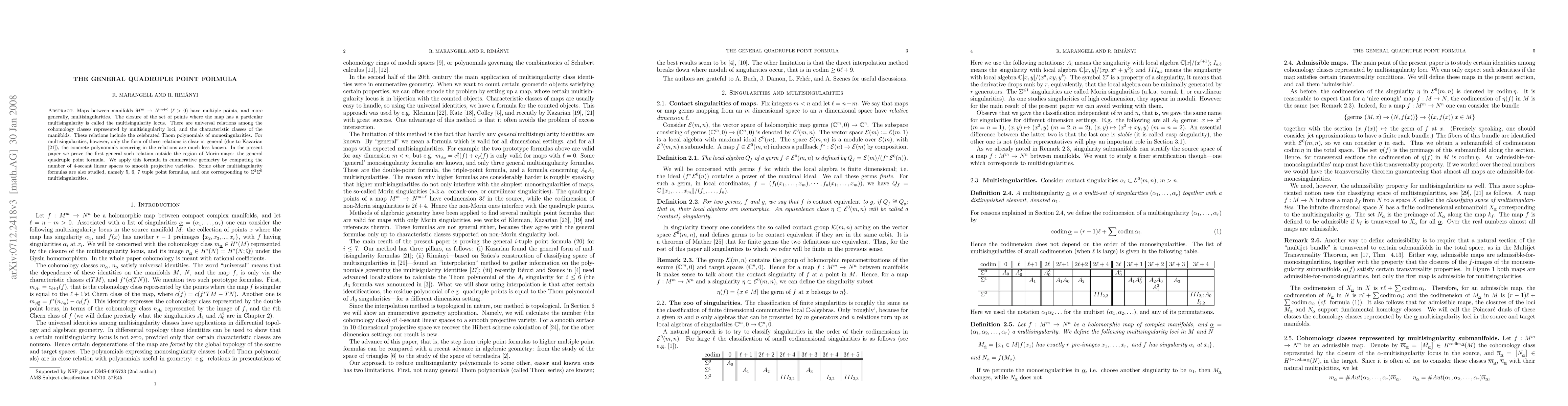 Maps between manifolds $M^m\to N^{m+\ell}$ ($\ell>0$) have multiple points, and more generally, multisingularities. The closure of the set of points where the map has a particular multisingularity is called the multisingularity locus. There are universal relations among the cohomology classes represented by multisingularity loci, and the characteristic classes of the manifolds. These relations include the celebrated Thom polynomials of monosingularities. For multisingularities, however, only the form of these relations is clear in general (due to Kazarian), the concrete polynomials occurring in the relations are much less known. In the present paper we prove the first general such relation outside the region of Morin-maps: the general quadruple point formula. We apply this formula in enumerative geometry by computing the number of 4-secant linear spaces to smooth projective varieties. Some other multisingularity formulas are also studied, namely 5, 6, 7 tuple point formulas, and one corresponding to $\Sigma^2\Sigma^0$ multisingularities.