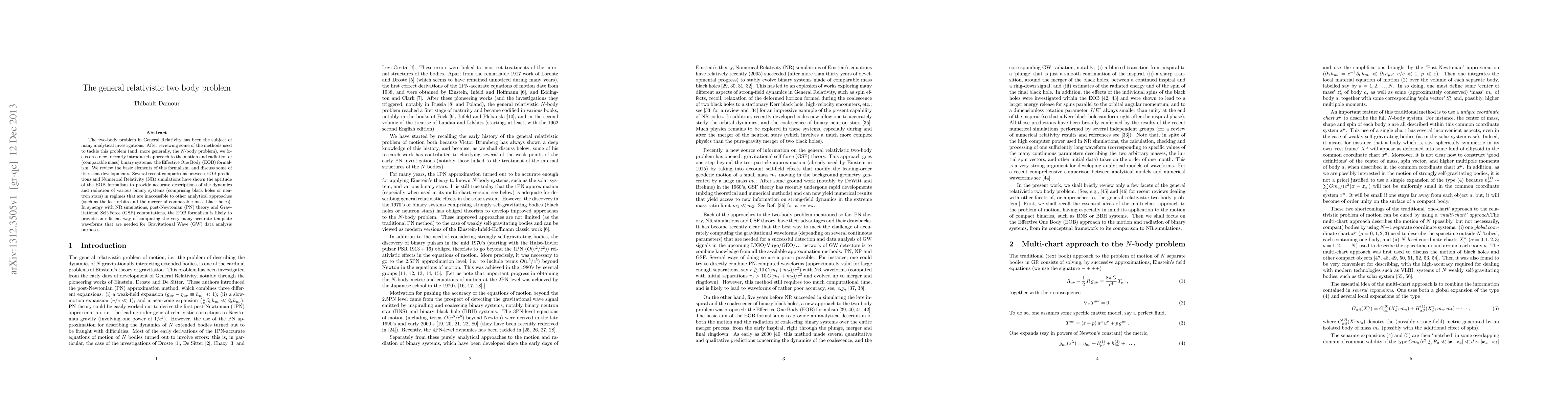 The two-body problem in General Relativity has been the subject of many analytical investigations. After reviewing some of the methods used to tackle this problem (and, more generally, the N-body problem), we focus on a new, recently introduced approach to the motion and radiation of (comparable mass) binary systems: the Effective One Body (EOB) formalism. We review the basic elements of this formalism, and discuss some of its recent developments. Several recent comparisons between EOB predictions and Numerical Relativity (NR) simulations have shown the aptitude of the EOB formalism to provide accurate descriptions of the dynamics and radiation of various binary systems (comprising black holes or neutron stars) in regimes that are inaccessible to other analytical approaches (such as the last orbits and the merger of comparable mass black holes). In synergy with NR simulations, post-Newtonian (PN) theory and Gravitational Self-Force (GSF) computations, the EOB formalism is likely to provide an efficient way of computing the very many accurate template waveforms that are needed for Gravitational Wave (GW) data analysis purposes.