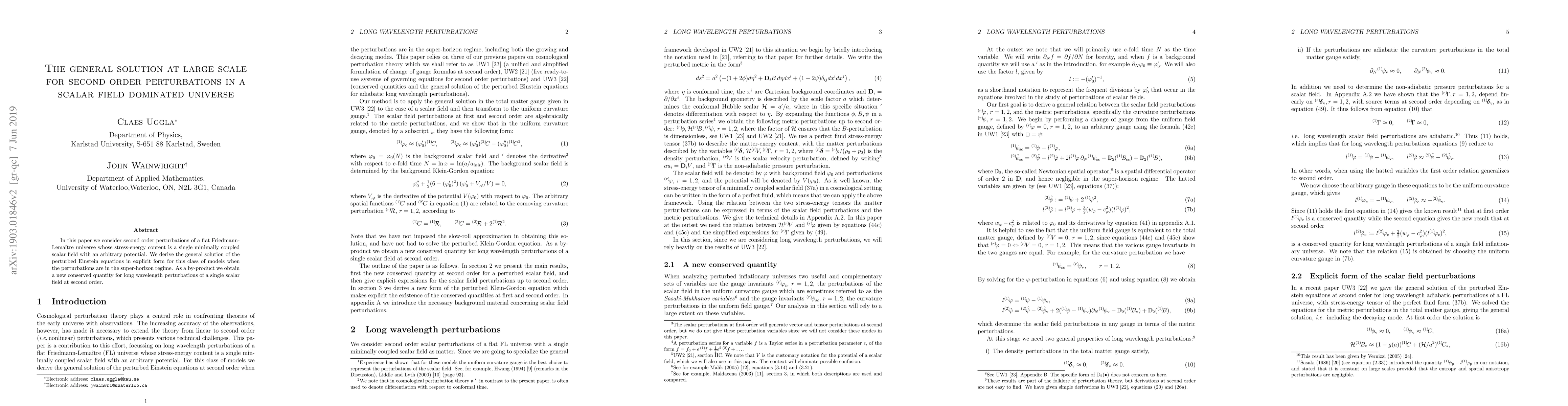 This paper derives the general solution for second-order perturbations in a flat, scalar field-dominated universe, focusing on the super-horizon regime. It also introduces a new conserved quantity for long wavelength perturbations at second order.