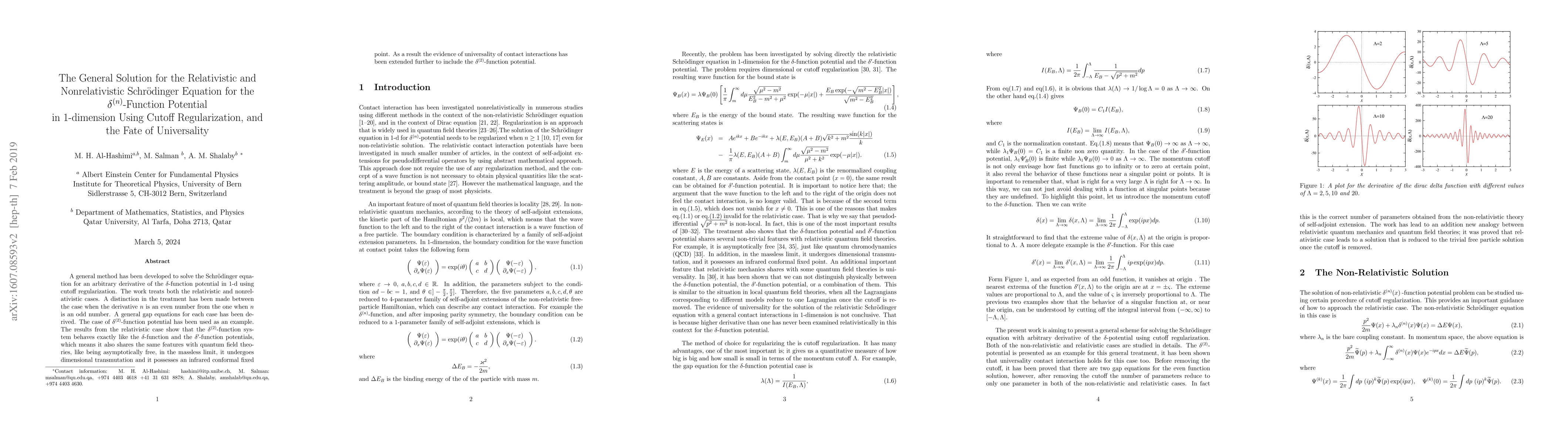 This paper presents a general solution method for the Schrödinger equation with a $\delta^{(n)}$-function potential in 1D using cutoff regularization, addressing both relativistic and nonrelativistic cases. It demonstrates universality in the $\delta^{(2)}$-function potential, showing it shares features like asymptotic freedom and dimensional transmutation with quantum field theories.