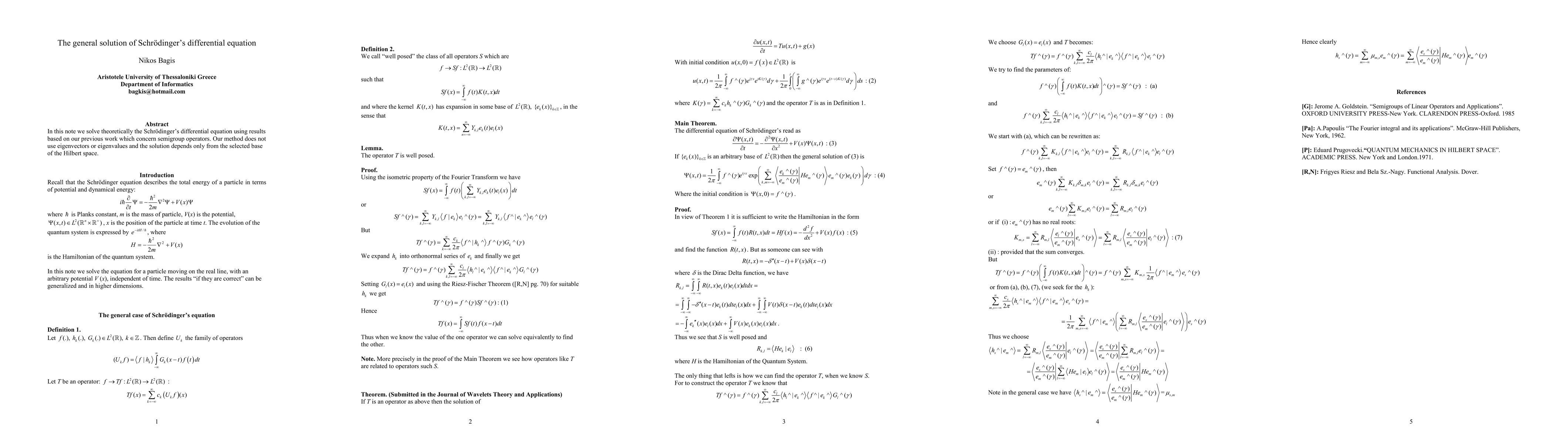 In this note we solve theoretically the Schrodingers differential equation using results based on our previous work which concern semigroup operators. Our method does not use eigenvectors or eigenvalues and the solution depends only from the selected base of the Hilbert space.