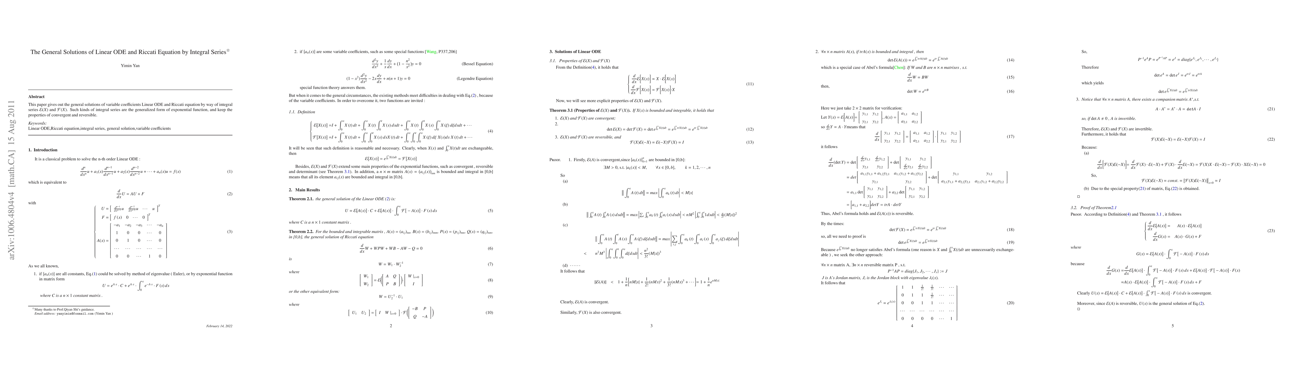 This paper gives out the general solutions of variable coefficients ODE and Riccati equation by way of integral series E(X) and F(X). Such kinds of integral series are the generalized form of exponential function, and keep the properties of convergent and reversible.
