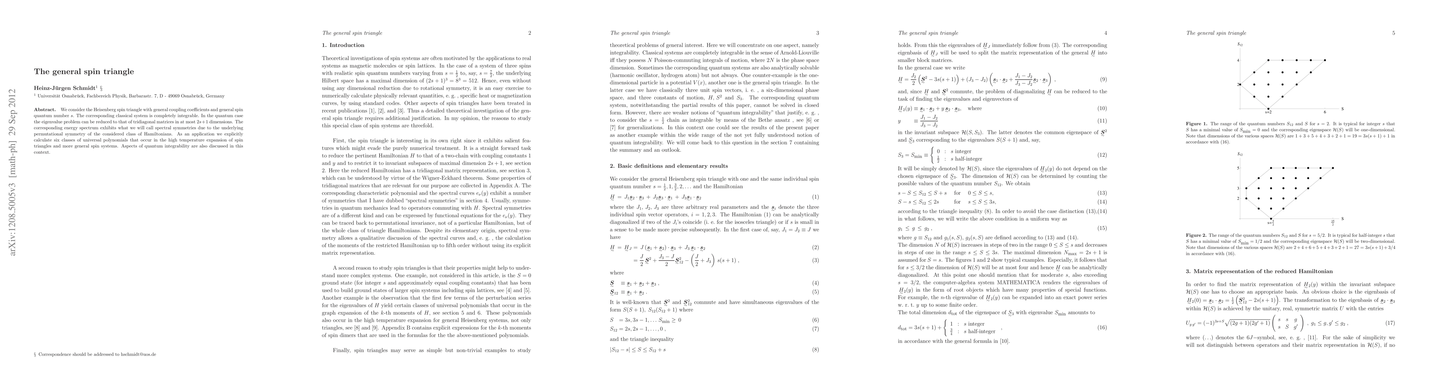 We consider the Heisenberg spin triangle with general coupling coefficients and general spin quantum number $s$. The corresponding classical system is completely integrable. In the quantum case the eigenvalue problem can be reduced to that of tridiagonal matrices in at most $2s+1$ dimensions. The corresponding energy spectrum exhibits what we will call spectral symmetries due to the underlying permutational symmetry of the considered class of Hamiltonians. As an application we explicitly calculate six classes of universal polynomials that occur in the high temperature expansion of spin triangles and more general spin systems. Aspects of quantum integrability are also discussed in this context.