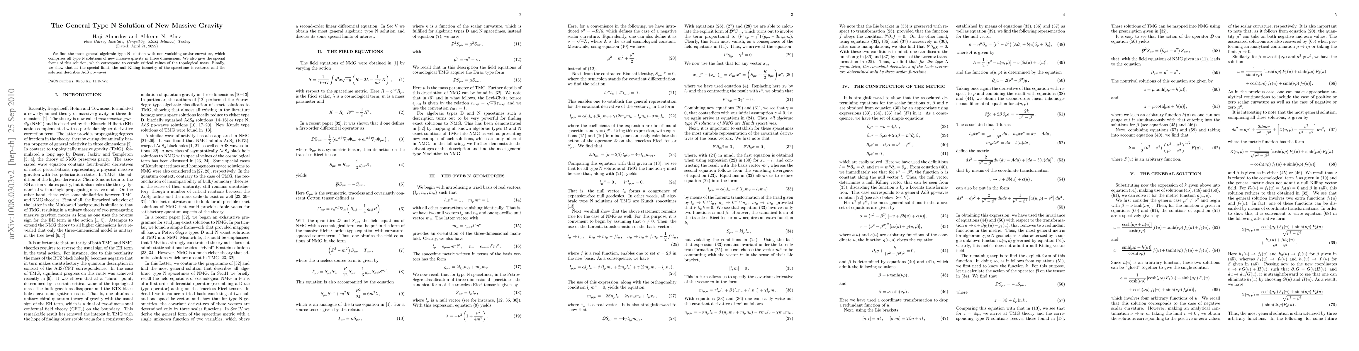 We find the most general algebraic type N solution with non-vanishing scalar curvature, which comprises all type N solutions of new massive gravity in three dimensions. We also give the special forms of this solution, which correspond to certain critical values of the topological mass. Finally, we show that at the special limit, the null Killing isometry of the spacetime is restored and the solution describes AdS pp-waves.