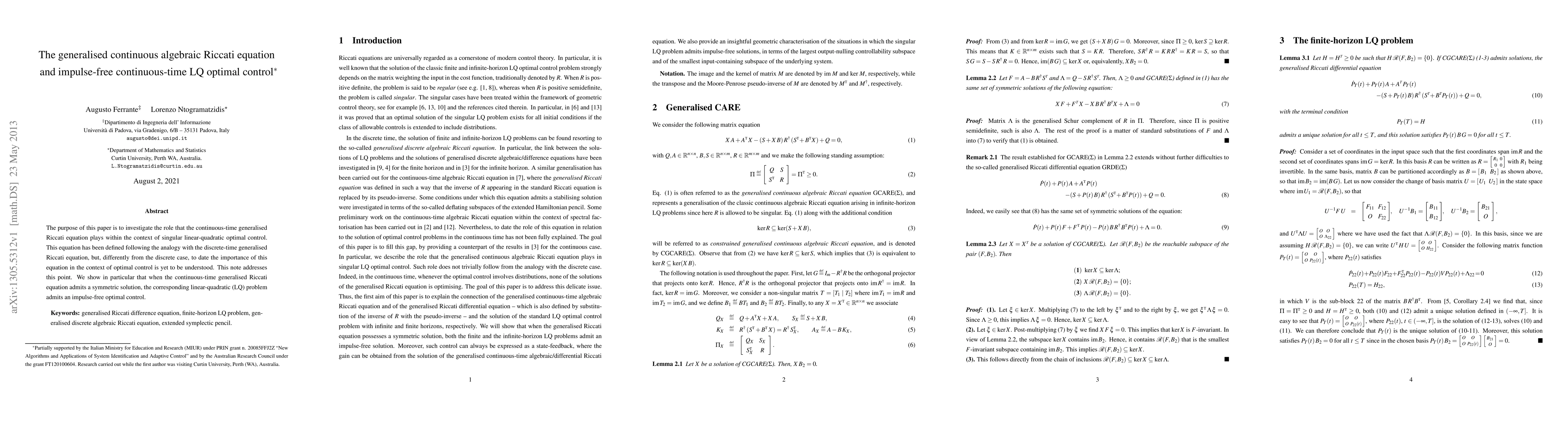 This paper explores the significance of the continuous-time generalised Riccati equation in singular linear-quadratic optimal control. It demonstrates that a symmetric solution to this equation leads to an impulse-free optimal control for the LQ problem.