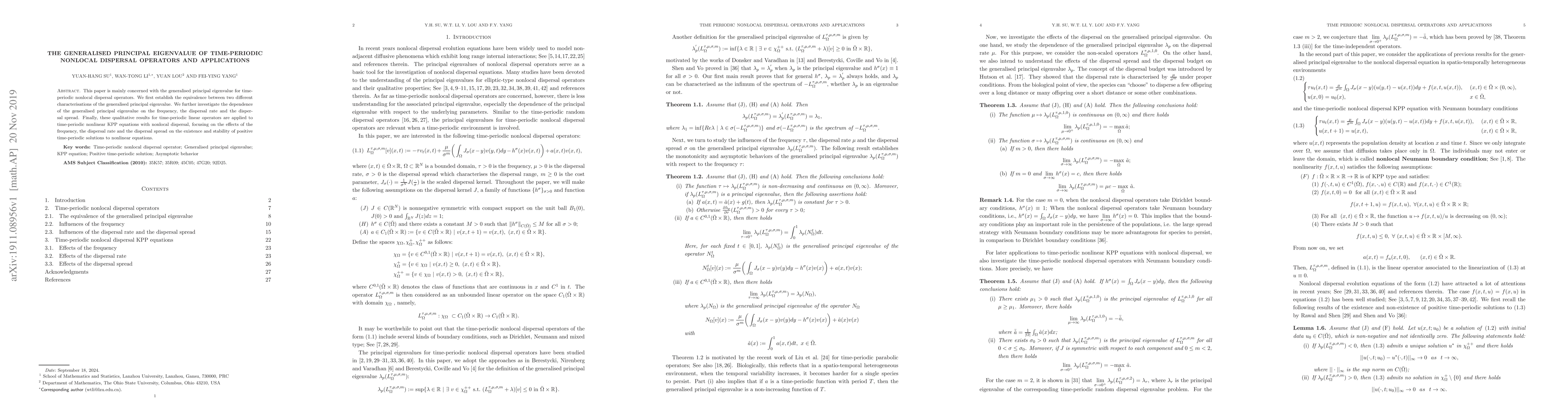 This paper investigates the generalised principal eigenvalue for time-periodic nonlocal dispersal operators, establishing its equivalence between two characterisations and exploring its dependence on frequency, dispersal rate, and spread. Applications to time-periodic nonlinear KPP equations focus on the impact of these factors on the existence and stability of positive time-periodic solutions.