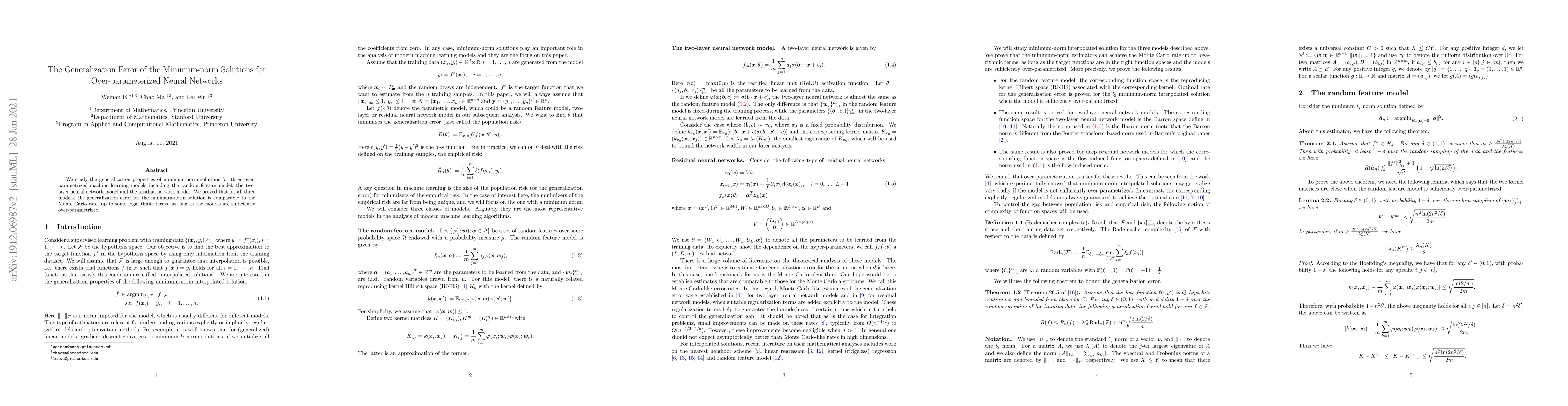 This paper investigates the generalization error of minimum-norm solutions in three over-parameterized neural network models, demonstrating that their generalization performance is comparable to the Monte Carlo rate, provided the models are sufficiently over-parameterized.