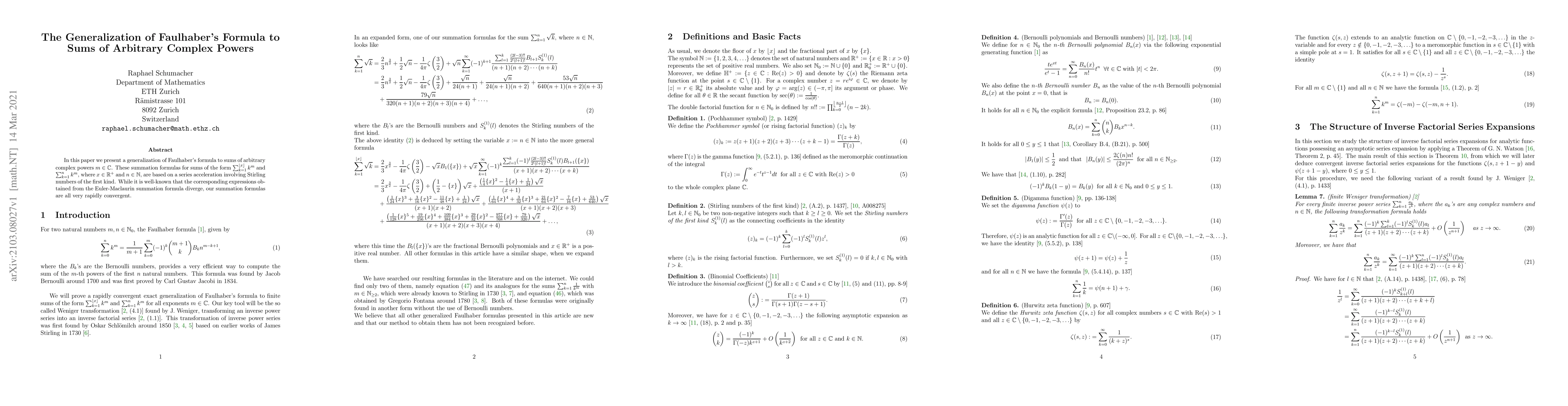 This paper generalizes Faulhaber's formula to sums involving arbitrary complex powers, utilizing series acceleration based on Stirling numbers. The derived summation formulas for $\sum_{k=1}^{\lfloor x\rfloor}k^{m}$ and $\sum_{k=1}^{n}k^{m}$ are rapidly convergent despite divergence issues with the Euler-Maclaurin summation formula.