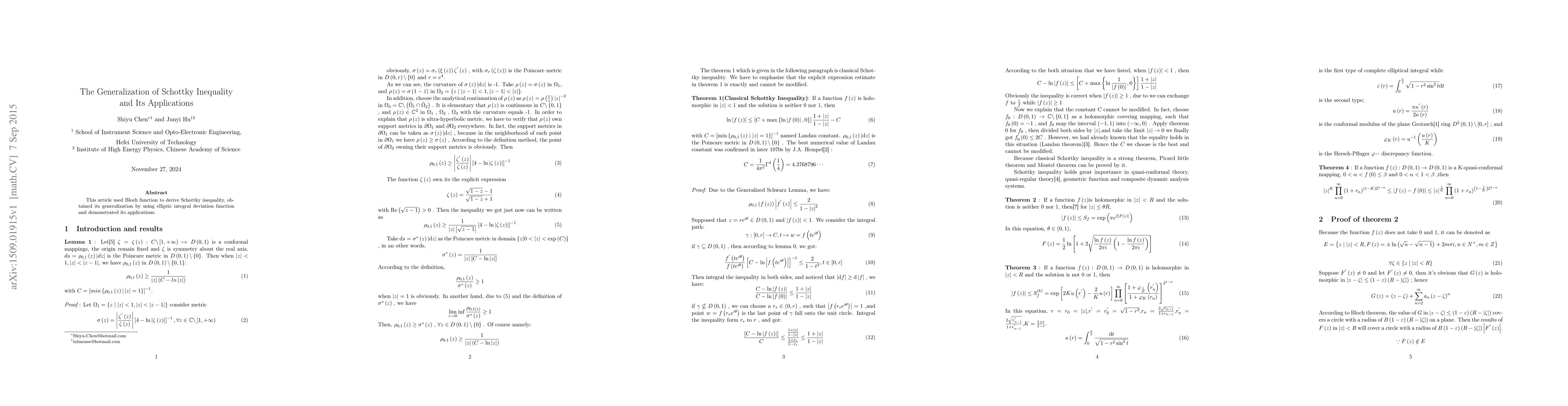 Summary: This paper generalizes Schottky inequality through the use of Bloch functions and elliptic integral deviation, showcasing its practical applications in various fields. The generalization enhances the understanding and utility of the original inequality.