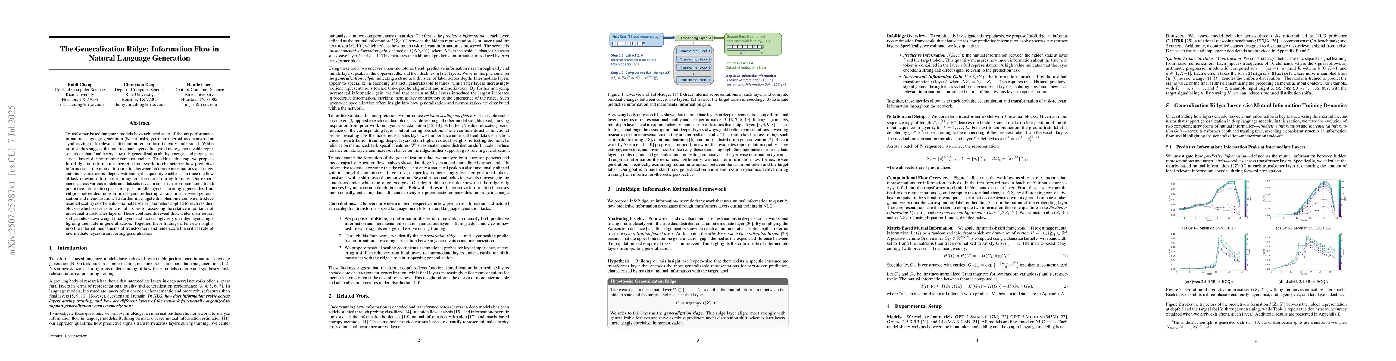 Transformer-based language models have achieved state-of-the-art performance in natural language generation (NLG) tasks, yet their internal mechanisms for synthesizing task-relevant information remain insufficiently understood. While prior studies suggest that intermediate layers often yield more generalizable representations than final layers, how this generalization ability emerges and propagates across layers during training remains unclear. To address this gap, we propose InfoRidge, an information-theoretic framework, to characterize how predictive information-the mutual information between hidden representations and target outputs-varies across depth. Estimating this quantity enables us to trace the flow of task-relevant information throughout the model during training. Our experiments across various models and datasets reveal a consistent non-monotonic trend: predictive information peaks in upper-middle layers-forming a generalization ridge-before declining in final layers, reflecting a transition between generalization and memorization. To further investigate this phenomenon, we introduce residual scaling coefficients-trainable scalar parameters applied to each residual block-which serve as functional probes for assessing the relative importance of individual transformer layers. These coefficients reveal that, under distribution shift, models downweight final layers and increasingly rely on ridge layers, highlighting their role in generalization. Together, these findings offer new insights into the internal mechanisms of transformers and underscore the critical role of intermediate layers in supporting generalization.