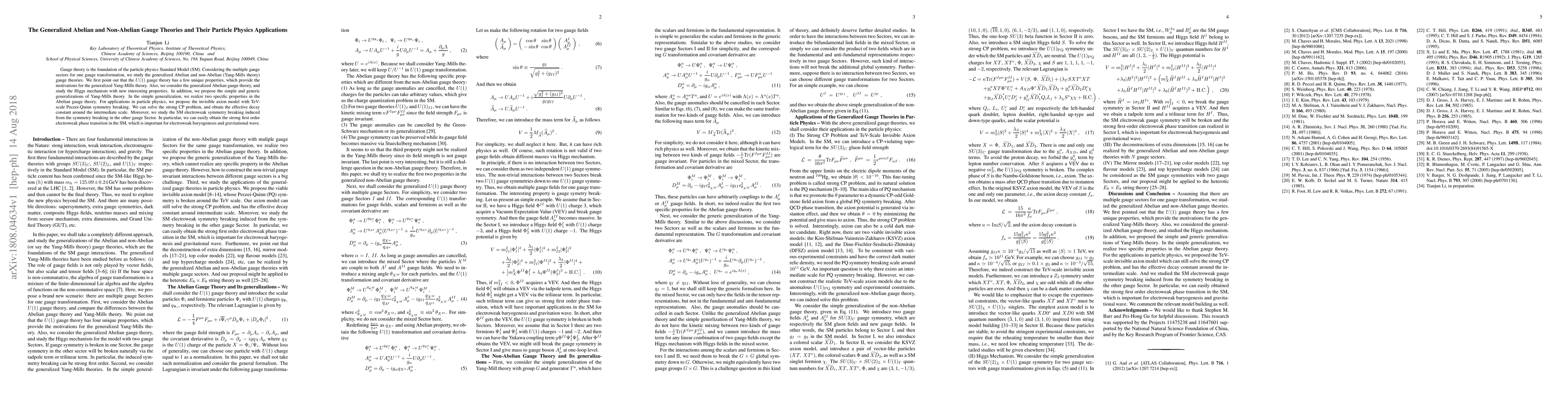 This paper explores generalized Abelian and non-Abelian gauge theories, proposing new models that address the strong CP problem and introduce mechanisms for electroweak symmetry breaking in particle physics. The study includes the invisible axion model and suggests a strong first-order electroweak phase transition.