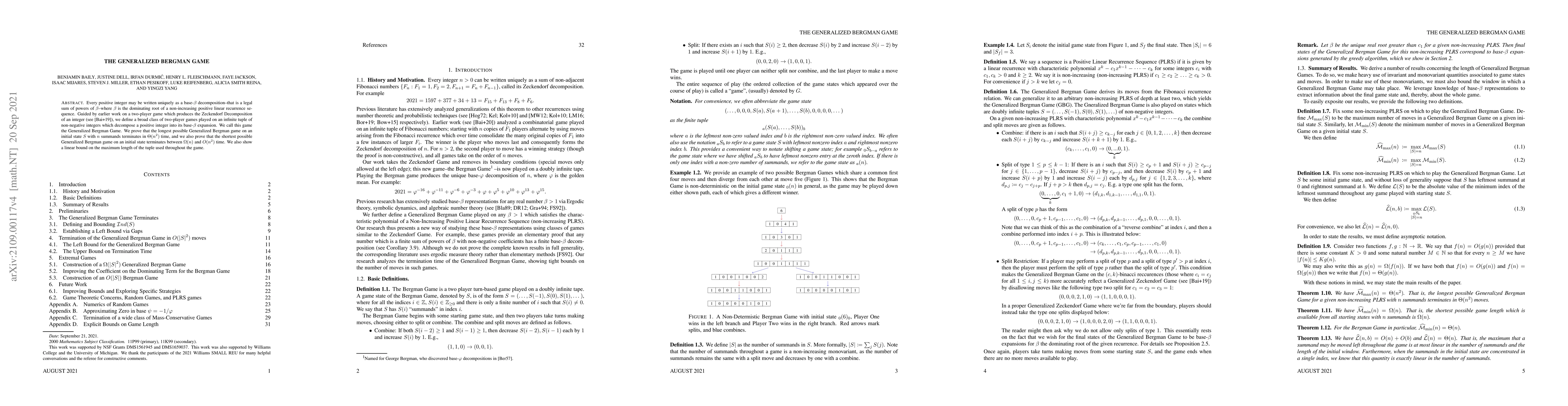 This paper introduces the Generalized Bergman Game, a two-player game that decomposes positive integers into base-$\beta$ expansions, where $\beta$ is derived from a non-increasing linear recurrence sequence. The authors prove that the longest game terminates in $\Theta(n^2)$ time, while the shortest game takes between $\Omega(n)$ and $O(n^2)$ time, and establish a linear bound on the game's tuple length.