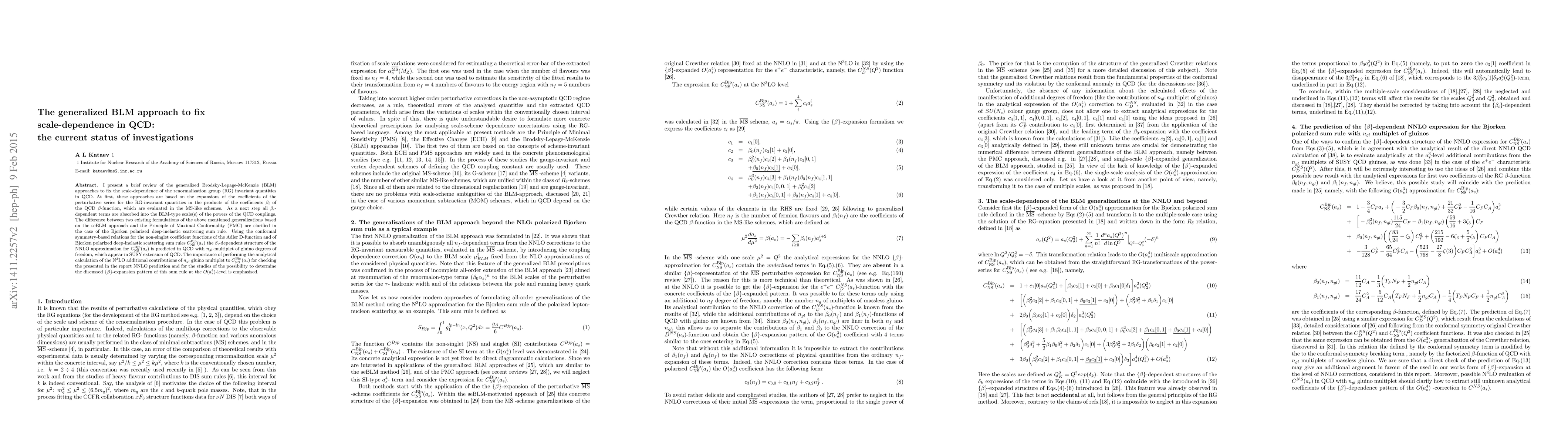 I present a brief review of the generalized Brodsky-Lepage-McKenzie (BLM) approaches to fix the scale-dependence of the renormalization group (RG) invariant quantities in QCD. At first, these approaches are based on the expansions of the coefficients of the perturbative series for the RG-invariant quantities in the products of the coefficients $\beta_i$ of the QCD $\beta$-function, which are evaluated in the MS-like schemes. As a next step all $\beta_i$-dependent terms are absorbed into the BLM-type scale(s) of the powers of the QCD couplings. The difference between two existing formulations of the above mentioned generalizations based on the seBLM approach and the Principle of Maximal Conformality (PMC) are clarified in the case of the Bjorken polarized deep-inelastic scattering sum rule. Using the conformal symmetry-based relations for the non-singlet coefficient functions of the Adler D-function and of Bjorken polarized deep-inelastic scattering sum rules $C^{\rm Bjp}_{\rm NS}(a_s)$ the $\beta_i$-dependent structure of the NNLO approximation for $C^{\rm Bjp}_{\rm NS}(a_s)$ is predicted in QCD with $n_{gl}$-multiplet of gluino degrees of freedom, which appear in SUSY extension of QCD. The importance of performing the analytical calculation of the N$^3$LO additional contributions of $n_{gl}$ gluino multiplet to $C^{\rm Bjp}_{\rm NS}(a_s)$ for checking the presented in the report NNLO prediction and for the studies of the possibility to determine the discussed $\{\beta\}$-expansion pattern of this sum rule at the $O(a_s^4)$-level is emphasised.