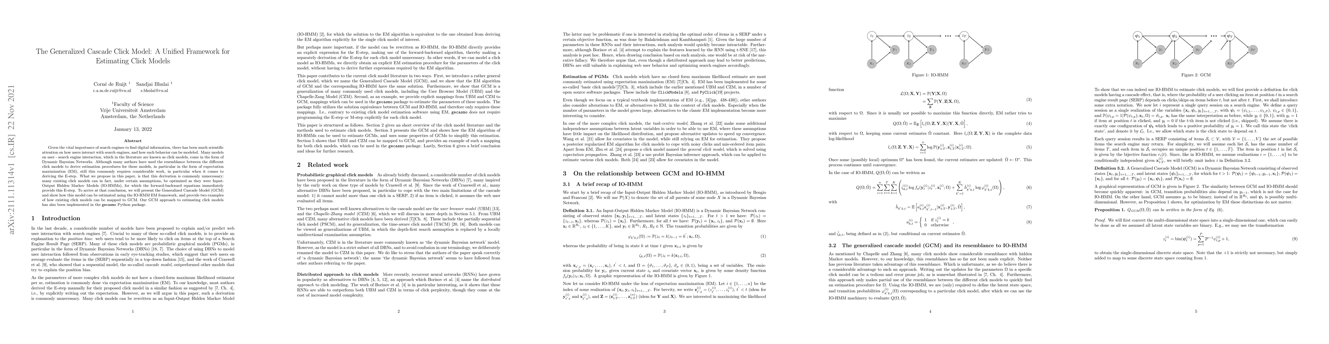 Given the vital importance of search engines to find digital information, there has been much scientific attention on how users interact with search engines, and how such behavior can be modeled. Many models on user - search engine interaction, which in the literature are known as click models, come in the form of Dynamic Bayesian Networks. Although many authors have used the resemblance between the different click models to derive estimation procedures for these models, in particular in the form of expectation maximization (EM), still this commonly requires considerable work, in particular when it comes to deriving the E-step. What we propose in this paper, is that this derivation is commonly unnecessary: many existing click models can in fact, under certain assumptions, be optimized as they were Input-Output Hidden Markov Models (IO-HMMs), for which the forward-backward equations immediately provide this E-step. To arrive at that conclusion, we will present the Generalized Cascade Model (GCM) and show how this model can be estimated using the IO-HMM EM framework, and provide two examples of how existing click models can be mapped to GCM. Our GCM approach to estimating click models has also been implemented in the gecasmo Python package.