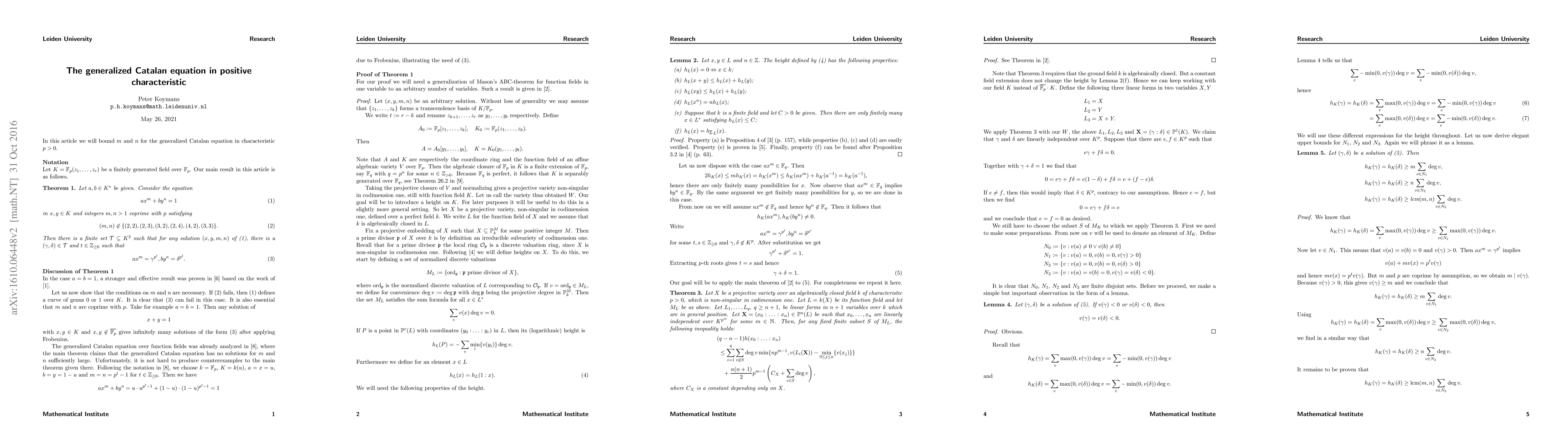 Let $K = \mathbb{F}_p(z_1, \ldots, z_r)$ be a finitely generated field over $\mathbb{F}_p$. In this article we study the generalized Catalan equation $ax^m + by^n = 1$ in $x, y \in K$ and integers $m, n > 1$ coprime with $p$. Our main result shows that there are only finitely many solutions up to the action of Frobenius.