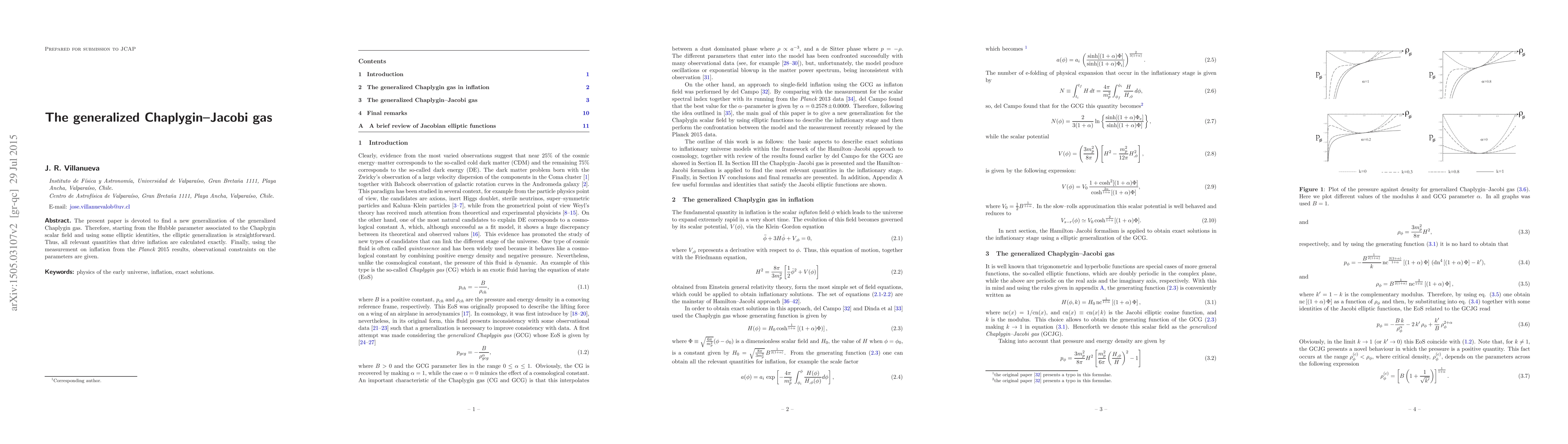 This paper introduces an elliptic generalization of the generalized Chaplygin gas, deriving exact inflation-driving quantities and applying observational constraints from the Planck 2015 results to determine parameter values.
