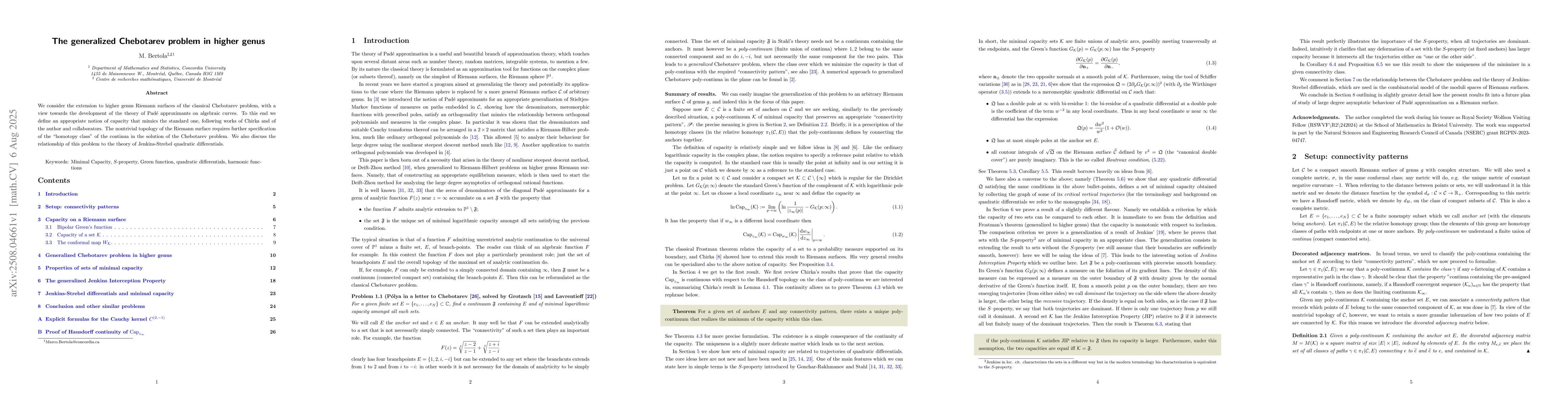 We consider the extension to higher genus Riemann surfaces of the classical Chebotarev problem, with a view towards the development of the theory of Pad\'e\ approximants on algebraic curves. To this end we define an appropriate notion of capacity that mimics the standard one, following works of Chirka and of the author and collaborators. The nontrivial topology of the Riemann surface requires further specification of the ``homotopy class'' of the continua in the solution of the Chebotarev problem. We also discuss the relationship of this problem to the theory of Jenkins-Strebel quadratic differentials.
