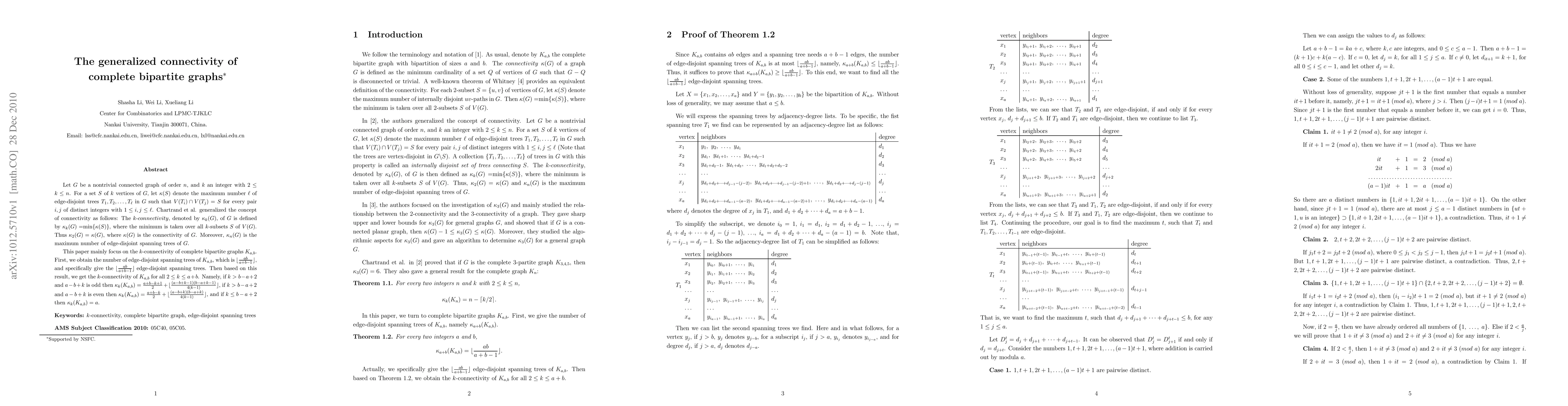 This paper investigates the generalized connectivity of complete bipartite graphs, providing formulas for the k-connectivity of these graphs, which include conditions based on the graph's parameters (a, b) and the value of k.