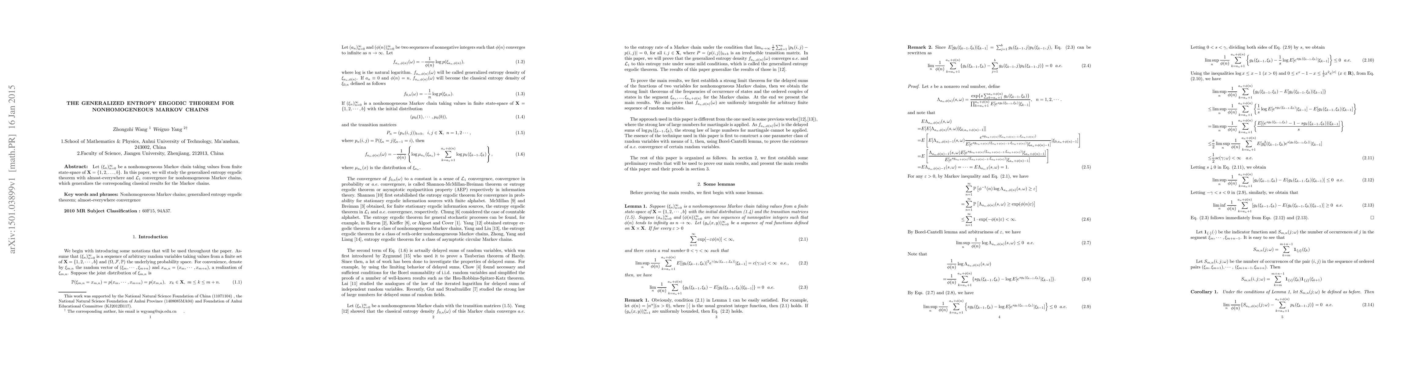 This paper investigates the generalized entropy ergodic theorem for nonhomogeneous Markov chains, proving almost-everywhere and $\mathcal{L}_1$ convergence, thereby extending classical results applicable to homogeneous Markov chains.
