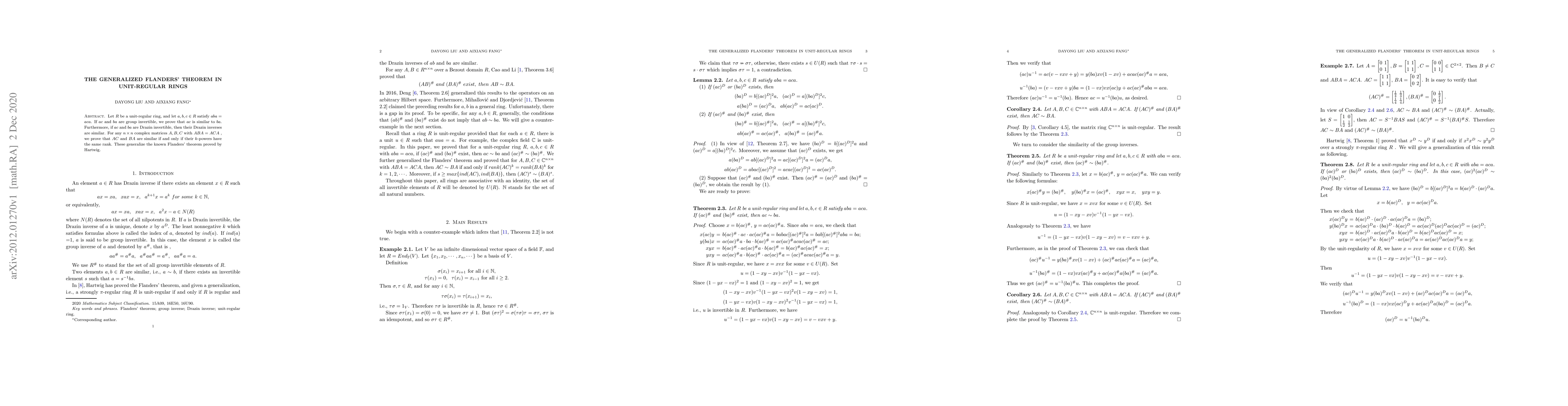 Let R be a unit-regular ring, and let a,b,c in R satisfy aba=aca. If ac and ba are group invertible, we prove that ac is similar to ba. Furthermore, if ac and ba are Drazin invertible, then their Drazin inverses are similar. For any n\times n complex matrices A,B,C with ABA = ACA ,we prove that AC and BA are similar if and only if their k-powers have the same rank. These generalize the known Flanders' theorem proved by Hartwig.