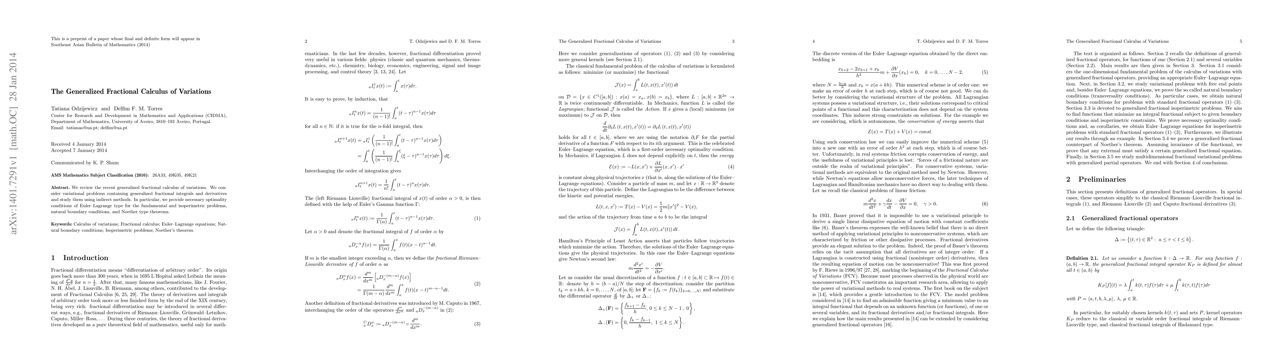 This paper reviews recent advancements in generalized fractional calculus of variations, focusing on variational problems involving generalized fractional integrals and derivatives. It establishes necessary optimality conditions, natural boundary conditions, and Noether type theorems for fundamental and isoperimetric problems using indirect methods.