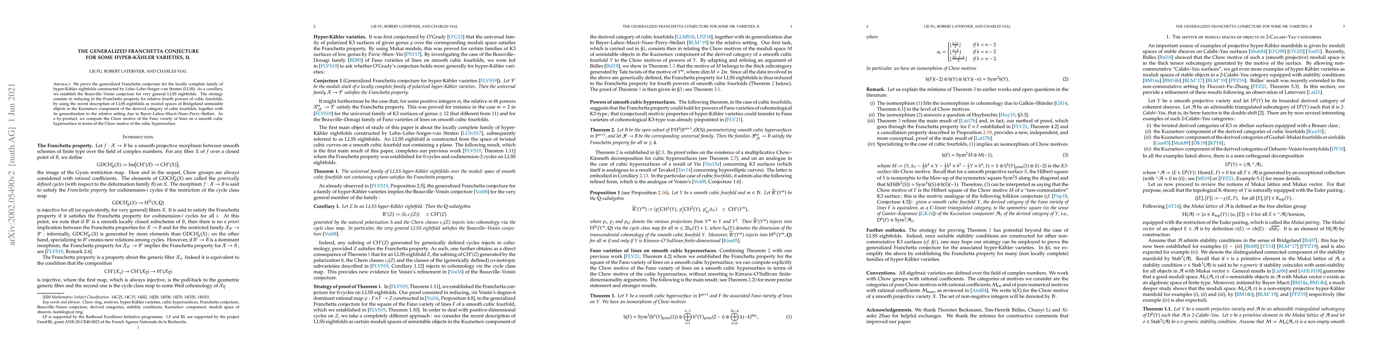 We prove the generalized Franchetta conjecture for the locally complete family of hyper-K\"ahler eightfolds constructed by Lehn-Lehn-Sorger-van Straten (LLSS). As a corollary, we establish the Beauville-Voisin conjecture for very general LLSS eightfolds. The strategy consists in reducing to the Franchetta property for relative fourth powers of cubic fourfolds, by using the recent description of LLSS eightfolds as moduli spaces of semistable objects in the Kuznetsov component of the derived category of cubic fourfolds, together with its generalization to the relative setting due to Bayer-Lahoz-Macr\`i-Nuer-Perry-Stellari. As a by-product, we compute the Chow motive of the Fano variety of lines on a smooth cubic hypersurface in terms of the Chow motive of the cubic hypersurface.