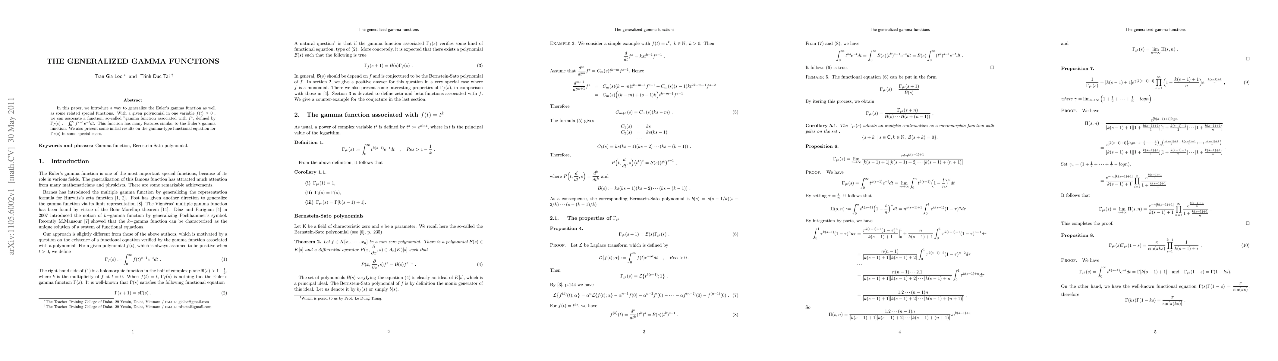 In this paper, we introduce a way to generalize the Euler's gamma function as well as some related special functions. With a given polynomial in one variable $f(t)\ge 0$, we can associate a function, so-called "gamma function associated with $f$", defined by $\Gamma_f(s) := \int_0^\infty f^{s-1} e^{-t} dt$. This function has many features similar to the Euler's gamma function. We also present some initial results on the gamma-type functional equation for $\Gamma_f(s)$ in some special cases.
