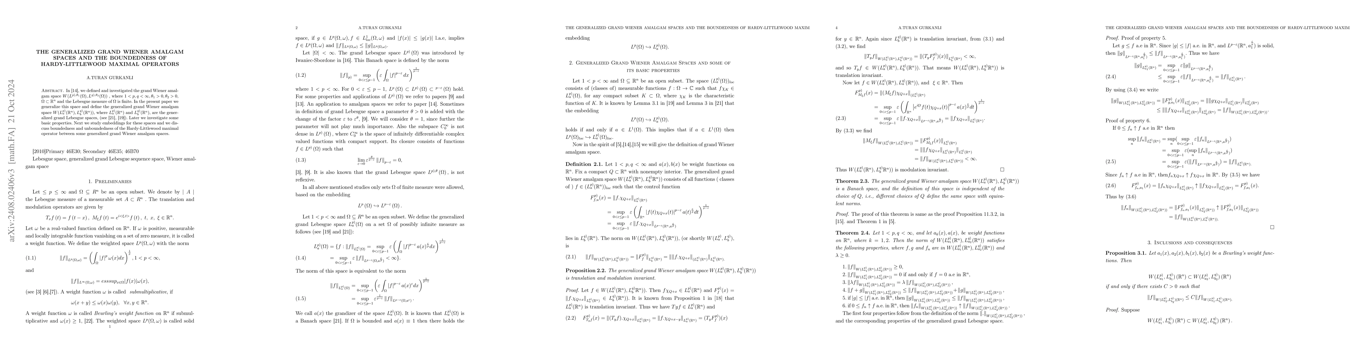 This paper generalizes the grand Wiener amalgam space to the generalized grand Wiener amalgam space, exploring properties and embeddings. It also investigates the boundedness of the Hardy-Littlewood maximal operator within these new spaces.