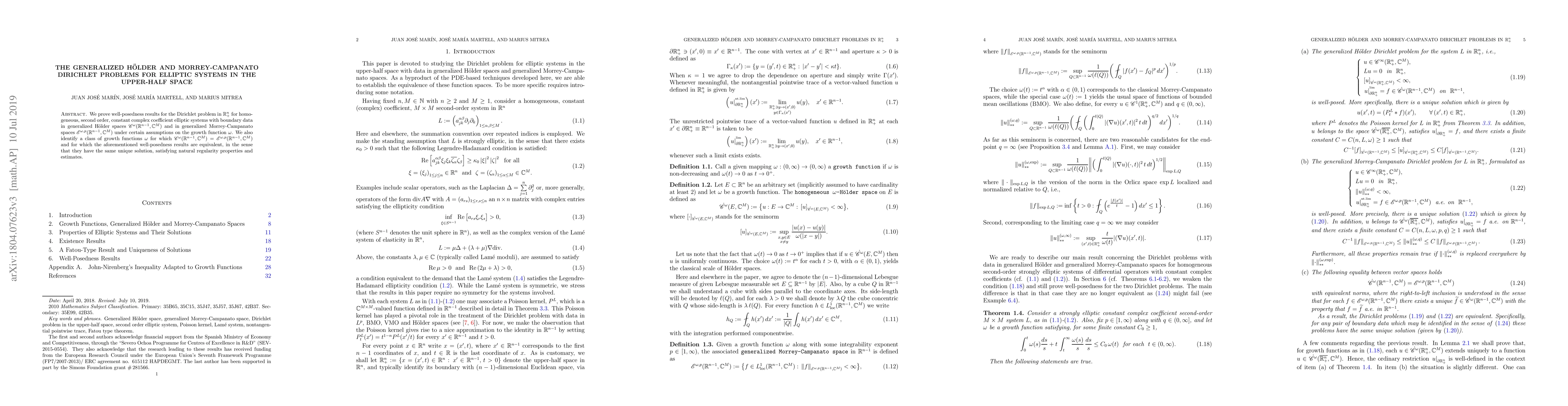 We prove well-posedness results for the Dirichlet problem in $\mathbb{R}^{n}_{+}$ for homogeneous, second order, constant complex coefficient elliptic systems with boundary data in generalized H\"older spaces $\mathscr{C}^{\omega}(\mathbb{R}^{n-1},\mathbb{C}^M)$ and in generalized Morrey-Campanato spaces $\mathscr{E}^{\omega,p}(\mathbb{R}^{n-1},\mathbb{C}^M)$ under certain assumptions on the growth function $\omega$. We also identify a class of growth functions $\omega$ for which $\mathscr{C}^{\omega}(\mathbb{R}^{n-1},\mathbb{C}^M)=\mathscr{E}^{\omega,p}(\mathbb{R}^{n-1},\mathbb{C}^M)$ and for which the aforementioned well-posedness results are equivalent, in the sense that they have the same unique solution, satisfying natural regularity properties and estimates.