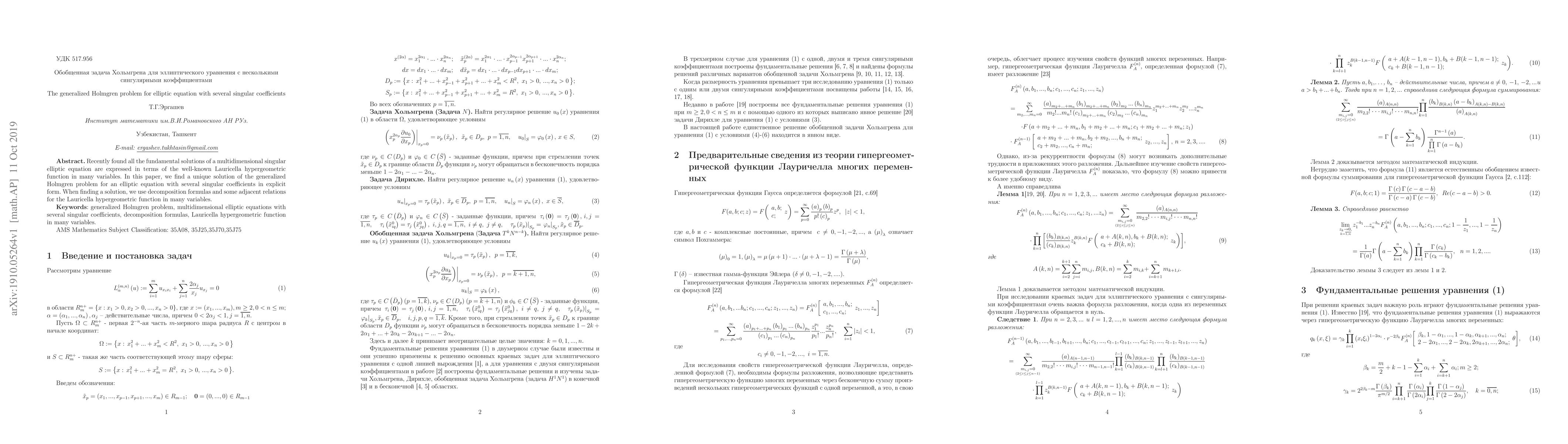 Summary: The paper presents a unique explicit solution to the generalized Holmgren problem for a multidimensional singular elliptic equation with multiple singular coefficients, utilizing decomposition formulas and properties of the Lauricella hypergeometric function. This solution extends fundamental findings expressed in terms of this hypergeometric function.