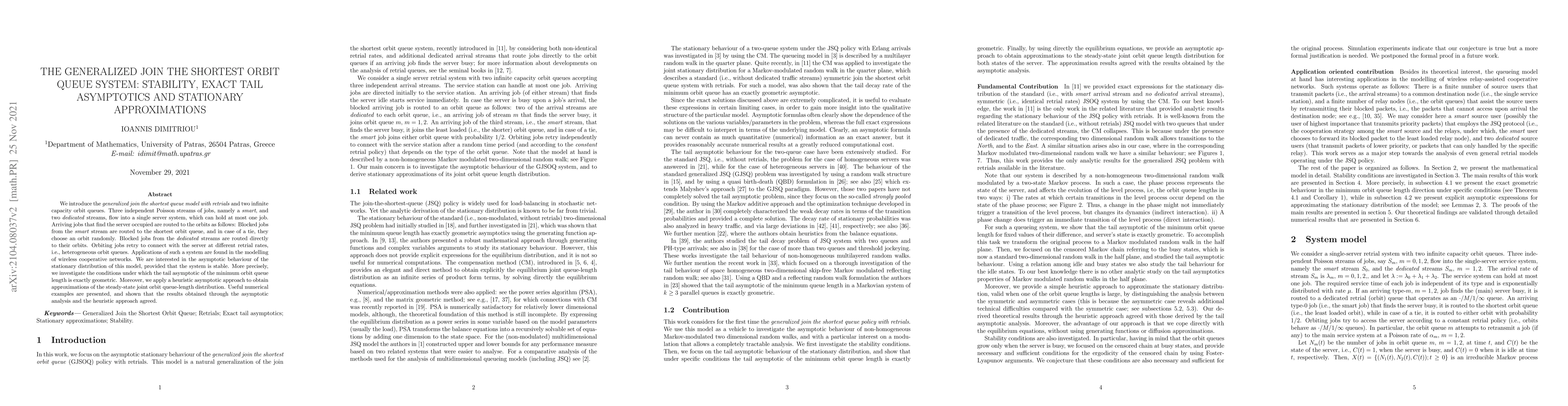 This paper explores the generalized join the shortest queue model with retrials and two infinite capacity orbit queues, analyzing the stability, exact tail asymptotics, and stationary approximations of the system. It focuses on the conditions for geometric tail asymptotics of the minimum orbit queue length and provides heuristic approximations for the steady-state joint orbit queue-length distribution, validated by numerical examples.