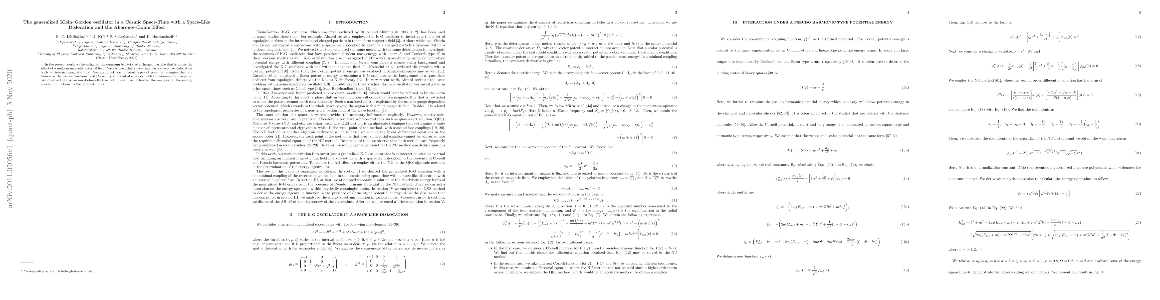 This paper explores the quantum dynamics of a charged particle in a cosmic space-time with a space-like dislocation and uniform magnetic field, analyzing the generalized Klein-Gordon oscillator under pseudo harmonic and Cornell type potentials. The study reveals the Aharonov-Bohm effect and extends the energy spectrum analysis to various limits.