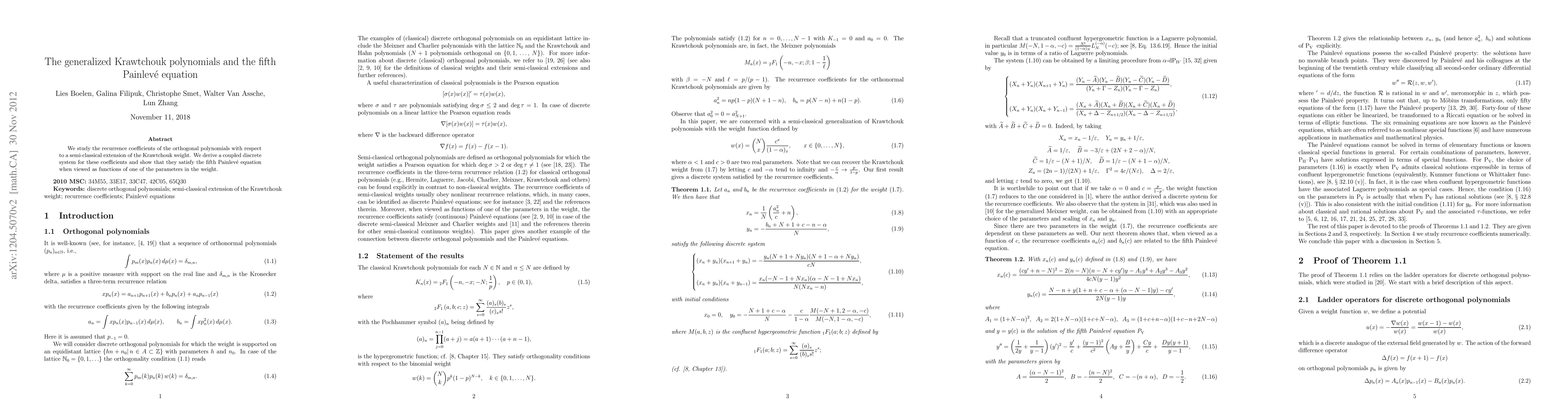 This paper investigates the recurrence coefficients of generalized Krawtchouk polynomials under a semi-classical weight extension. It reveals a coupled discrete system for these coefficients, which satisfies the fifth Painlevé equation when viewed as functions of a specific parameter.