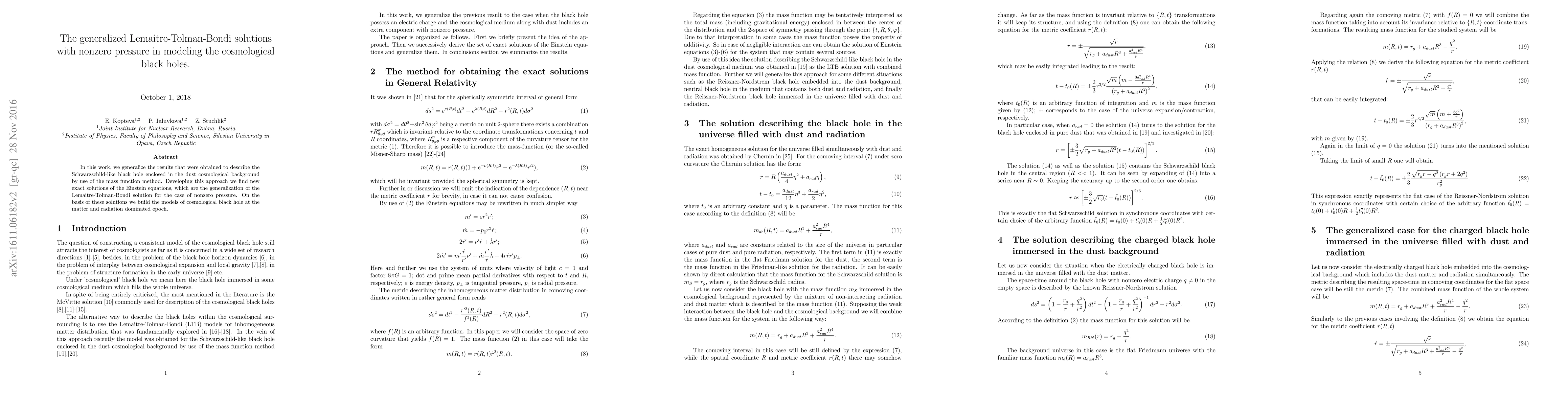 In this work we have obtained the set of new exact solutions of the Einstein equations that generalize the known Lemaitre-Tolman-Bondi solution for the certain case of nonzero pressure under zero spatial curvature. These solutions are pretending to describe the black hole immersed in the nonstatic cosmological background and give a possibility to investigate the problems concerning the effects of the cosmological expansion in gravitationally bounded systems. They may also be used as a seed models in the problem of structure formation in the universe at the epoch of matter and radiation decoupling. It was shown that each of the solutions obtained contains either the Reissner-Nordstrom or the Schwarzschild black hole in the central region of the space. It is demonstrated that the approach of the mass function use in solving the Einstein equations allows clear physical interpretation of the resulting solutions that is of much benefit to any their further application.