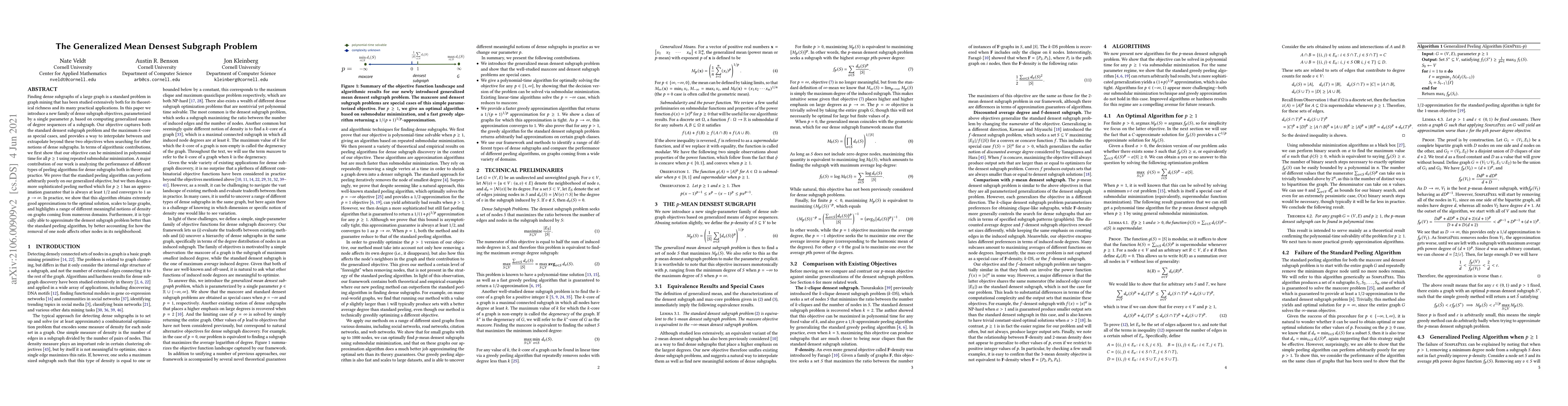 Finding dense subgraphs of a large graph is a standard problem in graph mining that has been studied extensively both for its theoretical richness and its many practical applications. In this paper we introduce a new family of dense subgraph objectives, parameterized by a single parameter $p$, based on computing generalized means of degree sequences of a subgraph. Our objective captures both the standard densest subgraph problem and the maximum $k$-core as special cases, and provides a way to interpolate between and extrapolate beyond these two objectives when searching for other notions of dense subgraphs. In terms of algorithmic contributions, we first show that our objective can be minimized in polynomial time for all $p \geq 1$ using repeated submodular minimization. A major contribution of our work is analyzing the performance of different types of peeling algorithms for dense subgraphs both in theory and practice. We prove that the standard peeling algorithm can perform arbitrarily poorly on our generalized objective, but we then design a more sophisticated peeling method which for $p \geq 1$ has an approximation guarantee that is always at least $1/2$ and converges to 1 as $p \rightarrow \infty$. In practice, we show that this algorithm obtains extremely good approximations to the optimal solution, scales to large graphs, and highlights a range of different meaningful notions of density on graphs coming from numerous domains. Furthermore, it is typically able to approximate the densest subgraph problem better than the standard peeling algorithm, by better accounting for how the removal of one node affects other nodes in its neighborhood.