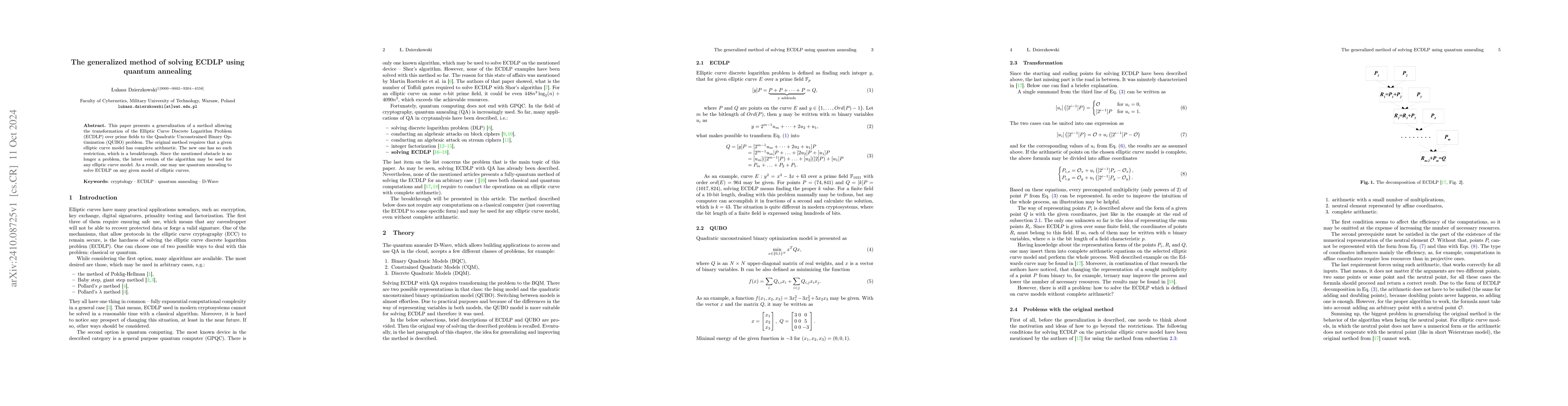 This paper presents a generalization of a method allowing the transformation of the Elliptic Curve Discrete Logarithm Problem (ECDLP) over prime fields to the Quadratic Unconstrained Binary Optimization (QUBO) problem. The original method requires that a given elliptic curve model has complete arithmetic. The new one has no such restriction, which is a breakthrough. Since the mentioned obstacle is no longer a problem, the latest version of the algorithm may be used for any elliptic curve model. As a result, one may use quantum annealing to solve ECDLP on any given model of elliptic curves.