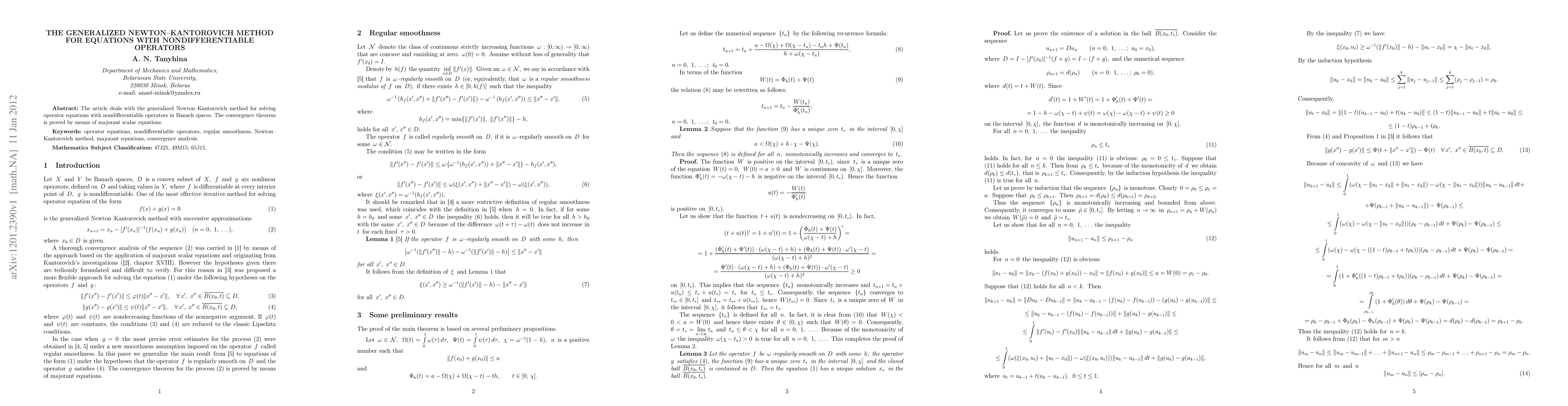 The article deals with the generalized Newton--Kantorovich method for solving operator equations with nondifferentiable operators in Banach spaces. The convergence theorem is proved by means of majorant scalar equations.
