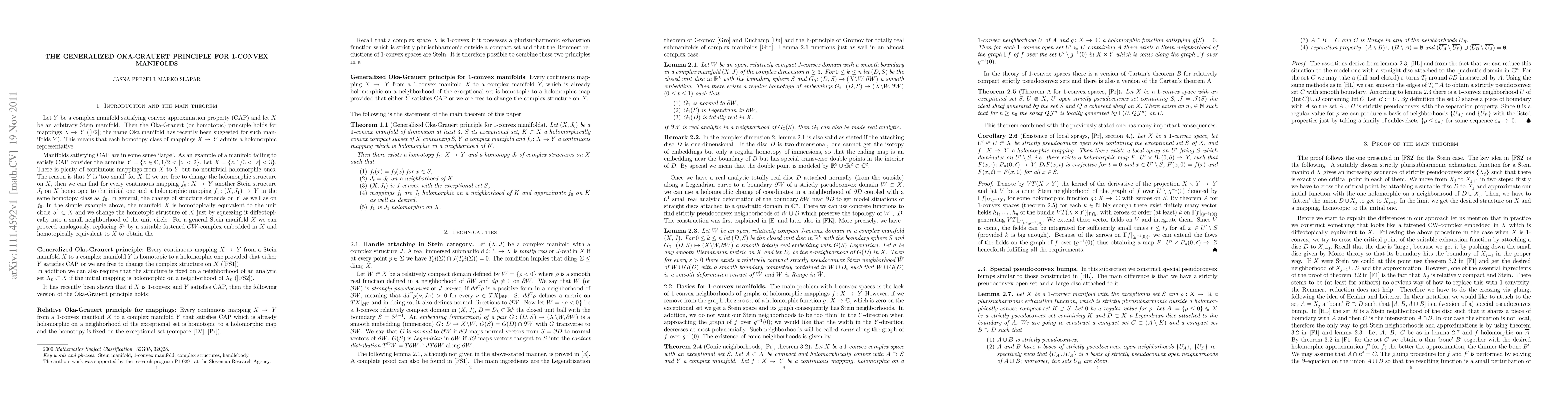 The paper proves the generalized Oka-Grauert principle for 1-convex manifolds, showing that continuous mappings to complex manifolds can be homotoped to holomorphic ones under certain conditions. Flexibility in changing the complex structure on the manifold is a crucial factor.