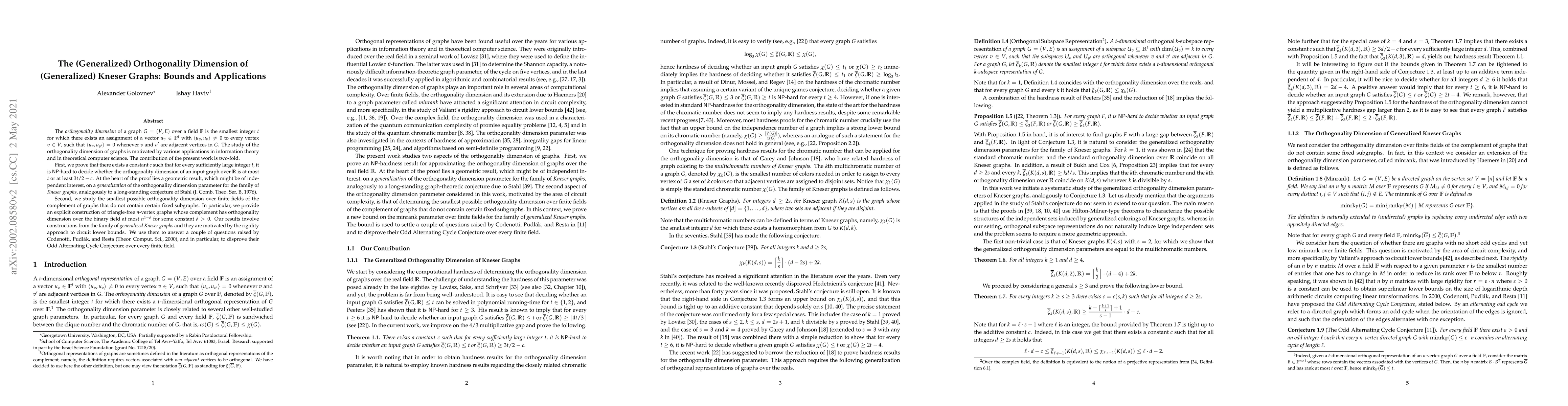 The orthogonality dimension of a graph $G=(V,E)$ over a field $\mathbb{F}$ is the smallest integer $t$ for which there exists an assignment of a vector $u_v \in \mathbb{F}^t$ with $\langle u_v,u_v \rangle \neq 0$ to every vertex $v \in V$, such that $\langle u_v, u_{v'} \rangle = 0$ whenever $v$ and $v'$ are adjacent vertices in $G$. The study of the orthogonality dimension of graphs is motivated by various applications in information theory and in theoretical computer science. The contribution of the present work is two-fold. First, we prove that there exists a constant $c$ such that for every sufficiently large integer $t$, it is $\mathsf{NP}$-hard to decide whether the orthogonality dimension of an input graph over $\mathbb{R}$ is at most $t$ or at least $3t/2-c$. At the heart of the proof lies a geometric result, which might be of independent interest, on a generalization of the orthogonality dimension parameter for the family of Kneser graphs, analogously to a long-standing conjecture of Stahl (J. Comb. Theo. Ser. B, 1976). Second, we study the smallest possible orthogonality dimension over finite fields of the complement of graphs that do not contain certain fixed subgraphs. In particular, we provide an explicit construction of triangle-free $n$-vertex graphs whose complement has orthogonality dimension over the binary field at most $n^{1-\delta}$ for some constant $\delta >0$. Our results involve constructions from the family of generalized Kneser graphs and they are motivated by the rigidity approach to circuit lower bounds. We use them to answer a couple of questions raised by Codenotti, Pudl\'{a}k, and Resta (Theor. Comput. Sci., 2000), and in particular, to disprove their Odd Alternating Cycle Conjecture over every finite field.