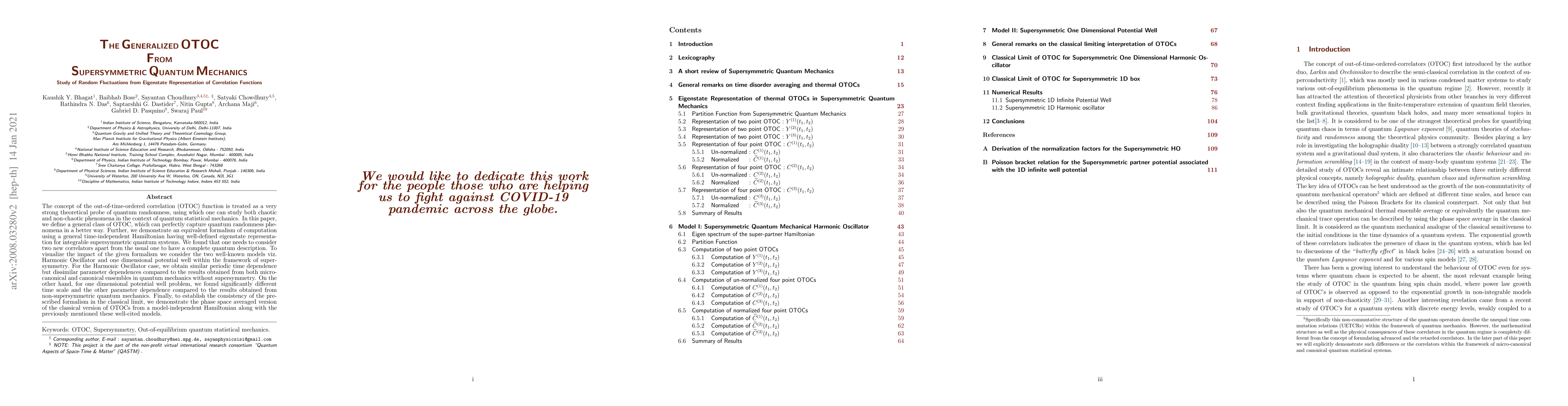 The concept of out-of-time-ordered correlation (OTOC) function is treated as a very strong theoretical probe of quantum randomness, using which one can study both chaotic and non-chaotic phenomena in the context of quantum statistical mechanics. In this paper, we define a general class of OTOC, which can perfectly capture quantum randomness phenomena in a better way. Further we demonstrate an equivalent formalism of computation using a general time independent Hamiltonian having well defined eigenstate representation for integrable supersymmetric quantum systems. We found that one needs to consider two new correlators apart from the usual one to have a complete quantum description. To visualize the impact of the given formalism we consider the two well known models viz. Harmonic Oscillator and one dimensional potential well within the framework of supersymmetry. For the Harmonic Oscillator case we obtain similar periodic time dependence but dissimilar parameter dependences compared to the results obtained from both micro-canonical and canonical ensembles in quantum mechanics without supersymmetry. On the other hand, for one dimensional potential well problem we found significantly different time scale and the other parameter dependence compared to the results obtained from non-supersymmetric quantum mechanics. Finally, to establish the consistency of the prescribed formalism in the classical limit, we demonstrate the phase space averaged version of the classical version of OTOCs from a model independent Hamiltonian along with the previously mentioned these well cited models.