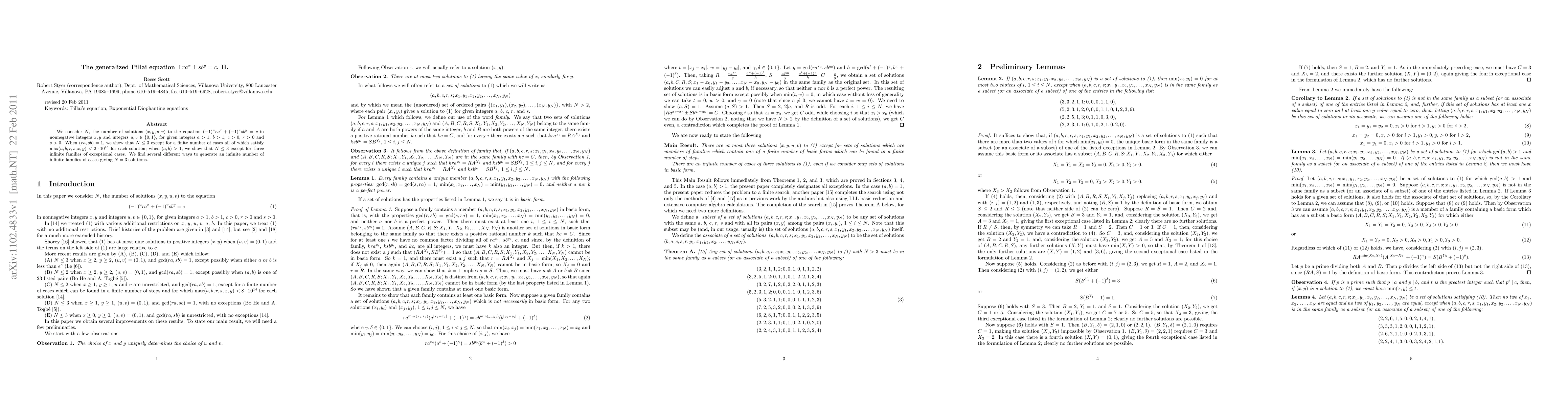 We consider $N$, the number of solutions $(x,y,u,v)$ to the equation $ (-1)^u r a^x + (-1)^v s b^y = c $ in nonnegative integers $x, y$ and integers $u, v \in \{0,1\}$, for given integers $a>1$, $b>1$, $c>0$, $r>0$ and $s>0$. When $(ra,sb)=1$, we show that $N \le 3$ except for a finite number of cases all of which satisfy $\max(a,b,r,s, x,y) < 2 \cdot 10^{15}$ for each solution; when $(a,b)>1$, we show that $N \le 3$ except for three infinite families of exceptional cases. We find several different ways to generate an infinite number of infinite families of cases giving N=3 solutions.