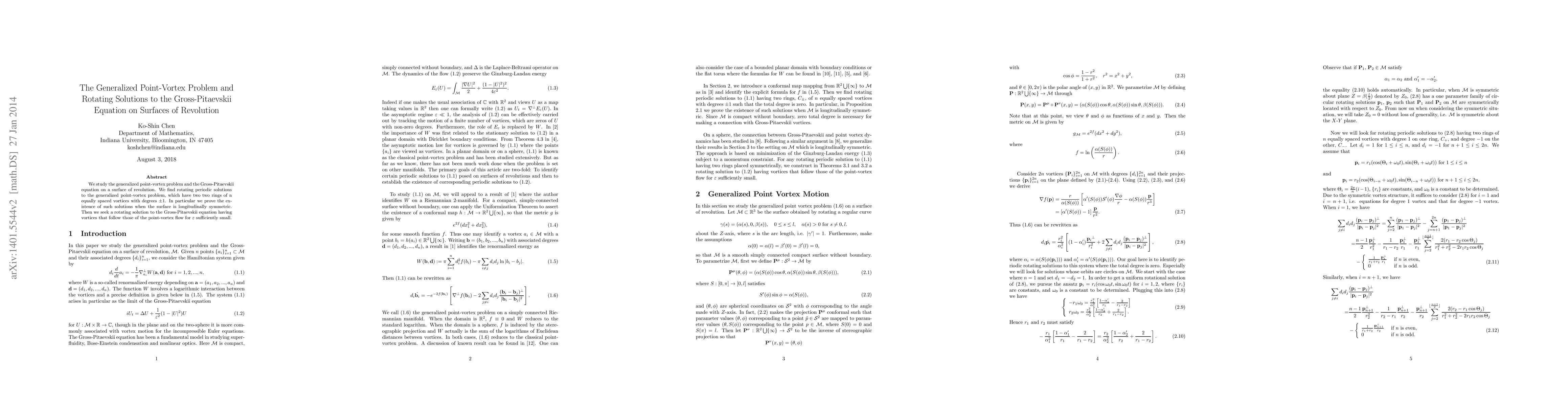 This paper investigates rotating periodic solutions to the generalized point-vortex problem and the Gross-Pitaevskii equation on surfaces of revolution, finding two rings of equally spaced vortices and proving their existence for longitudinally symmetric surfaces. It also explores rotating solutions to the Gross-Pitaevskii equation that mimic the point-vortex flow for small parameters.